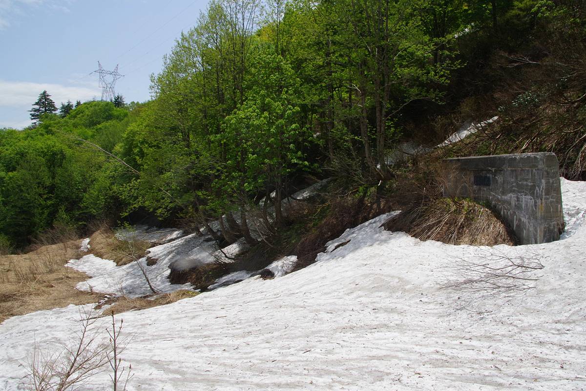 かまぼこ形に膨らんだトンネルアーチ(坑道)の外壁が、残雪から僅かに露出していた。