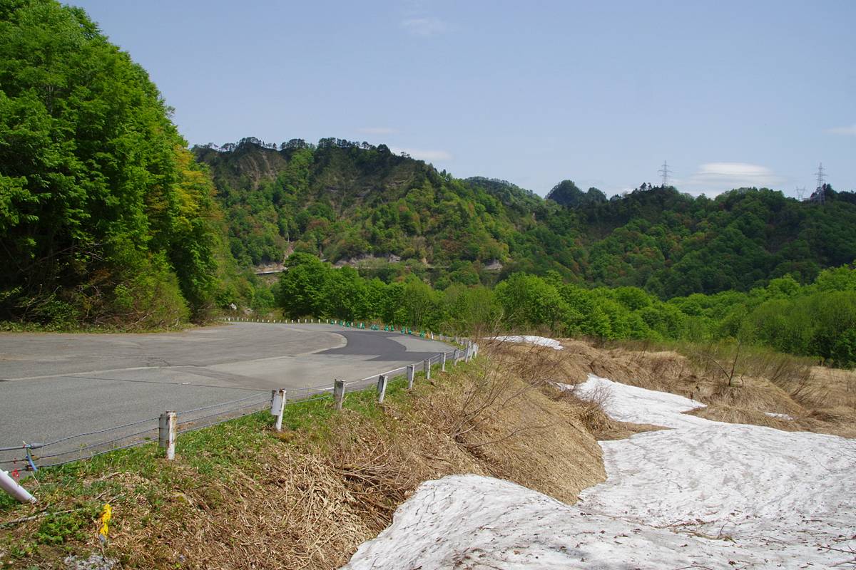 2021年5月撮影、旧田子倉駅付近の国道252号六十里越の道路風景。