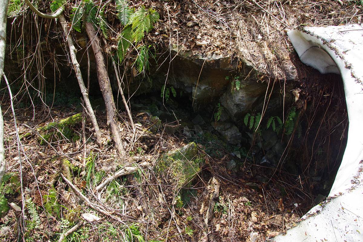 路肩に自転車を停め、徒歩でガードロープを越えて路外へ。旧坑口の観察へ向かう。