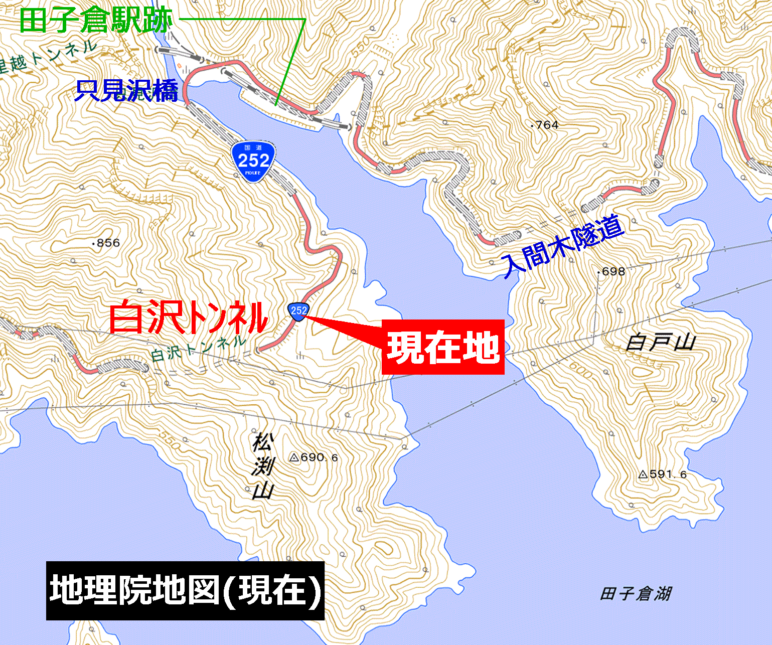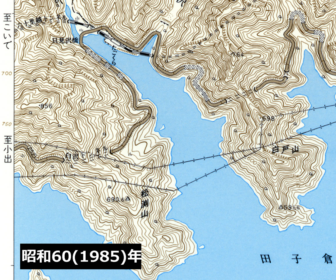 「石川県民氏」の言う通り、国道252号の白沢トンネルには旧トンネルがあった。そのことは彼も指摘する現地の遺構や右図のような歴代地形図の変化から読み取ることができる。