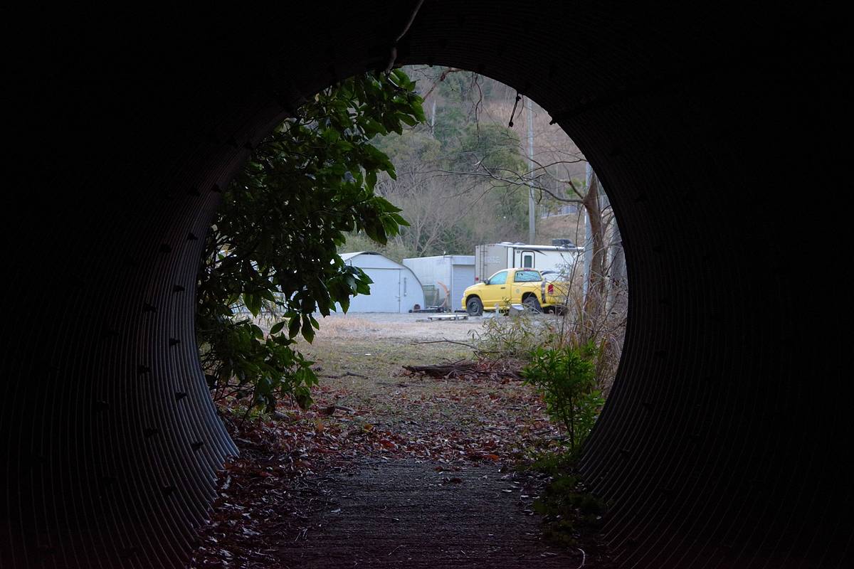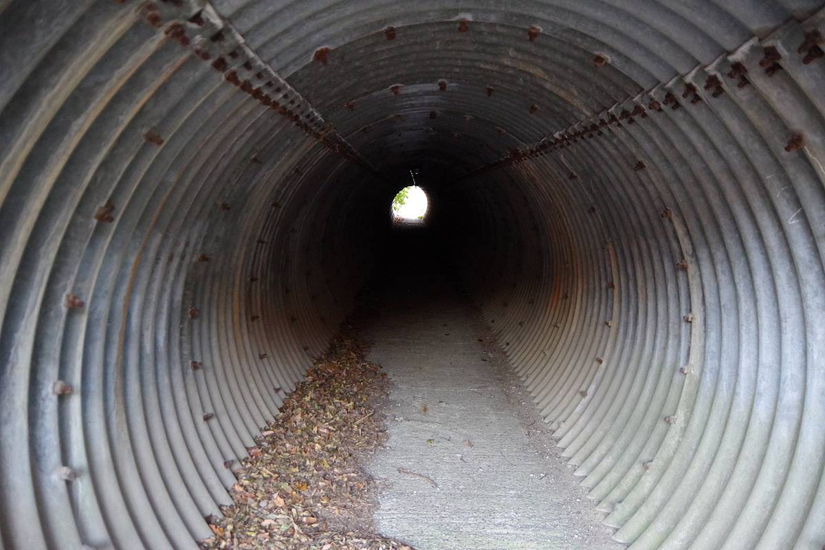 だがこのトンネルでは、まるで築堤を潜る水路暗渠の如きサイズ感のコルゲートパイプが、トンネルの断面というよりは、コルゲートパイプの最も基本的形状である真円形断面に近い形のまま使われている。