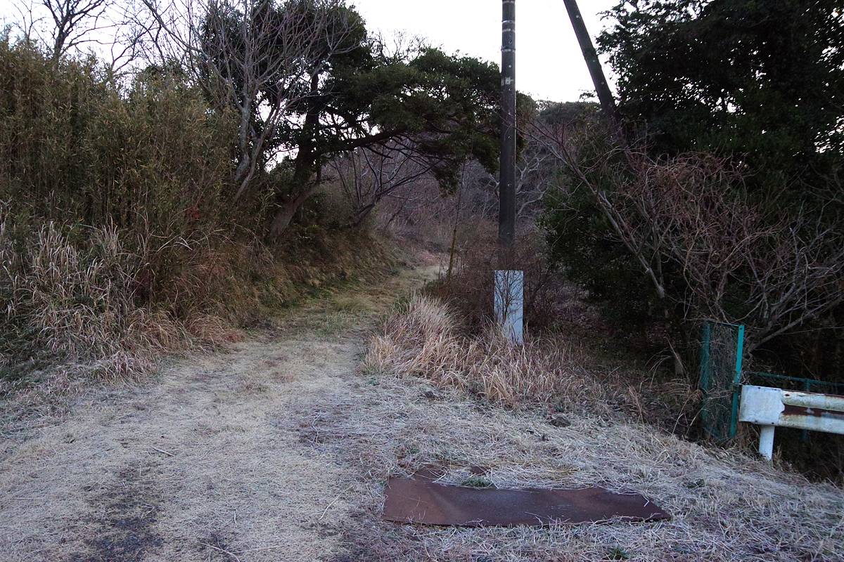 直線の登り坂の途中だが、ここから左へ別れる砂利道がある。そして分岐を無視して直進しようとすると、そこに「この先社有地につき進入禁止」の看板が掲げられている。