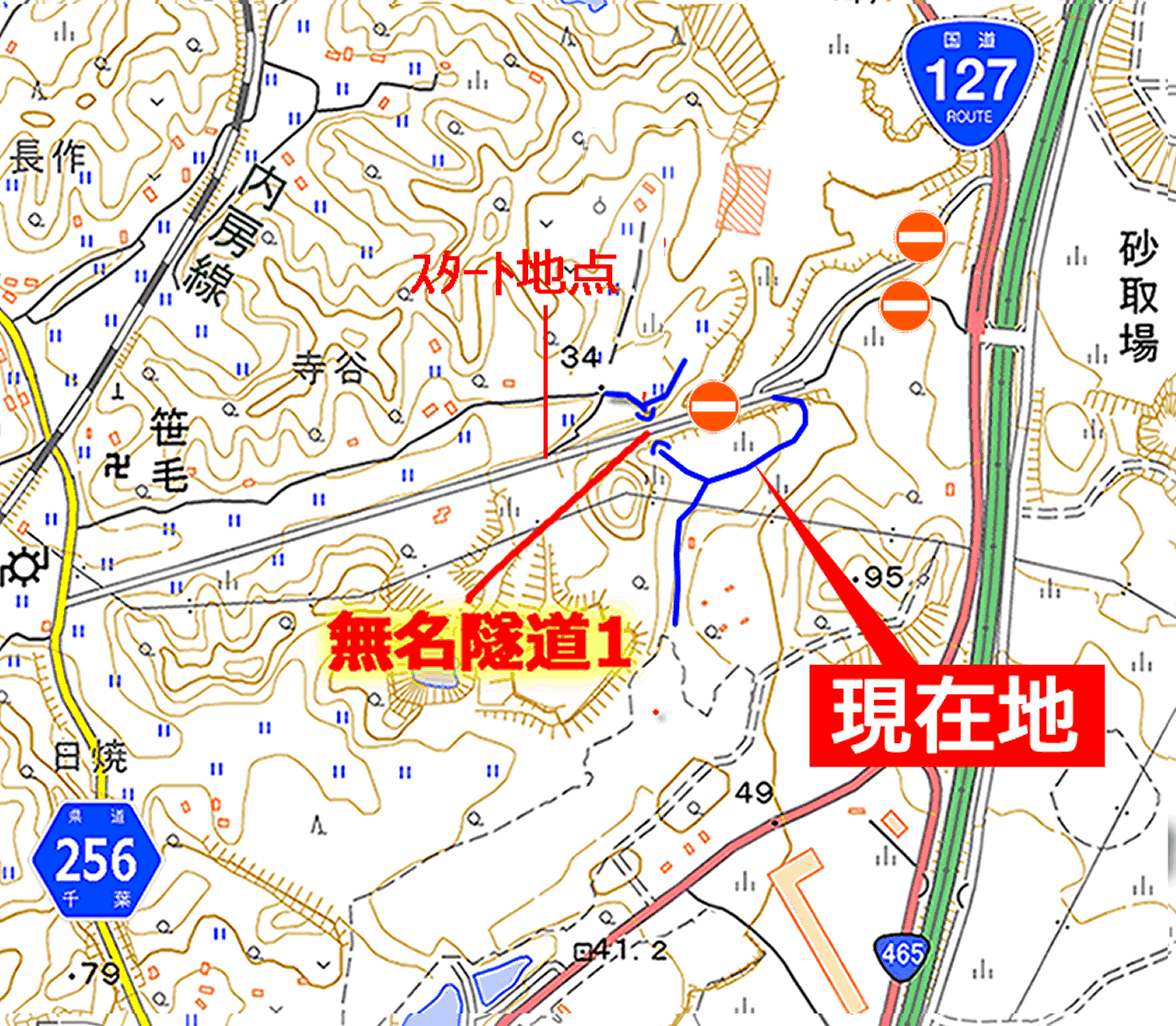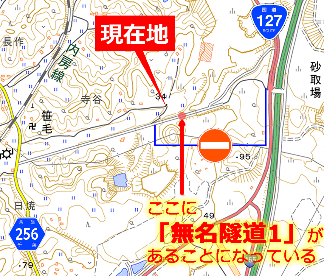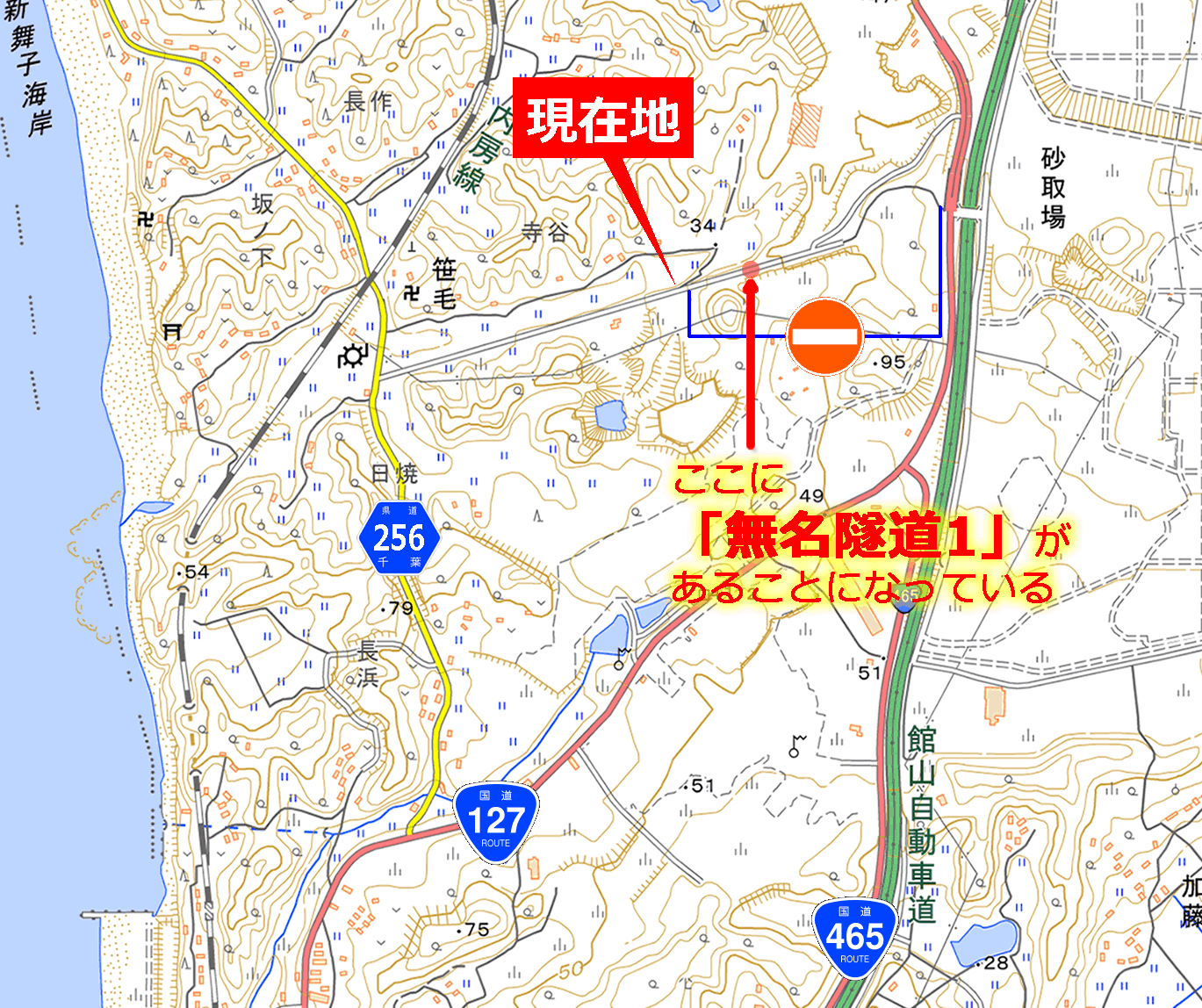 地理院地図上に“青い線”で地図にない道路と「無名隧道1」を描き足した。