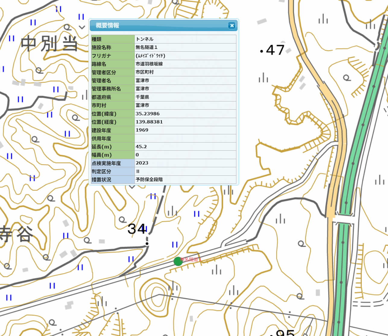 見慣れた地理院地図上に、緑色の丸いアイコンで1本のトンネルの位置がプロットされている。元の地図には見えないトンネルである。