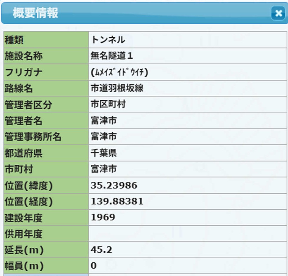 最近になって国土交通省が新たに公開した「全国道路施設点検データベース〜損傷マップ〜」は、トンネルや橋の在処を知りたい探索者にとって本当に便利なサイトである。道路法による供用中の道路という条件はつくが、この条件を満たす国内全ての橋やトンネルの位置を、簡単な諸元と共に、地図上で見ることができる。しかも無料で! これまで、「トンネルリスト」などで名称が判明していても所在の分からなかった小規模なトンネルの在処を知る最強の武器である。