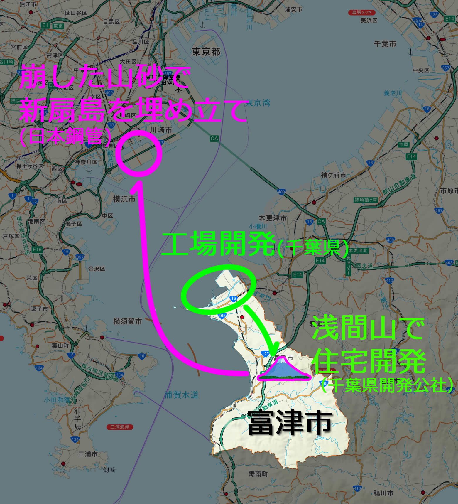 時を同じくして、日本鋼管株式会社は自社工場移転用地として扇島に新たな埋立地を造成するための土砂を欲しており、ここに浅間山を切り崩した山砂で新扇島を作るという一石二鳥の計画が起ち上がった。