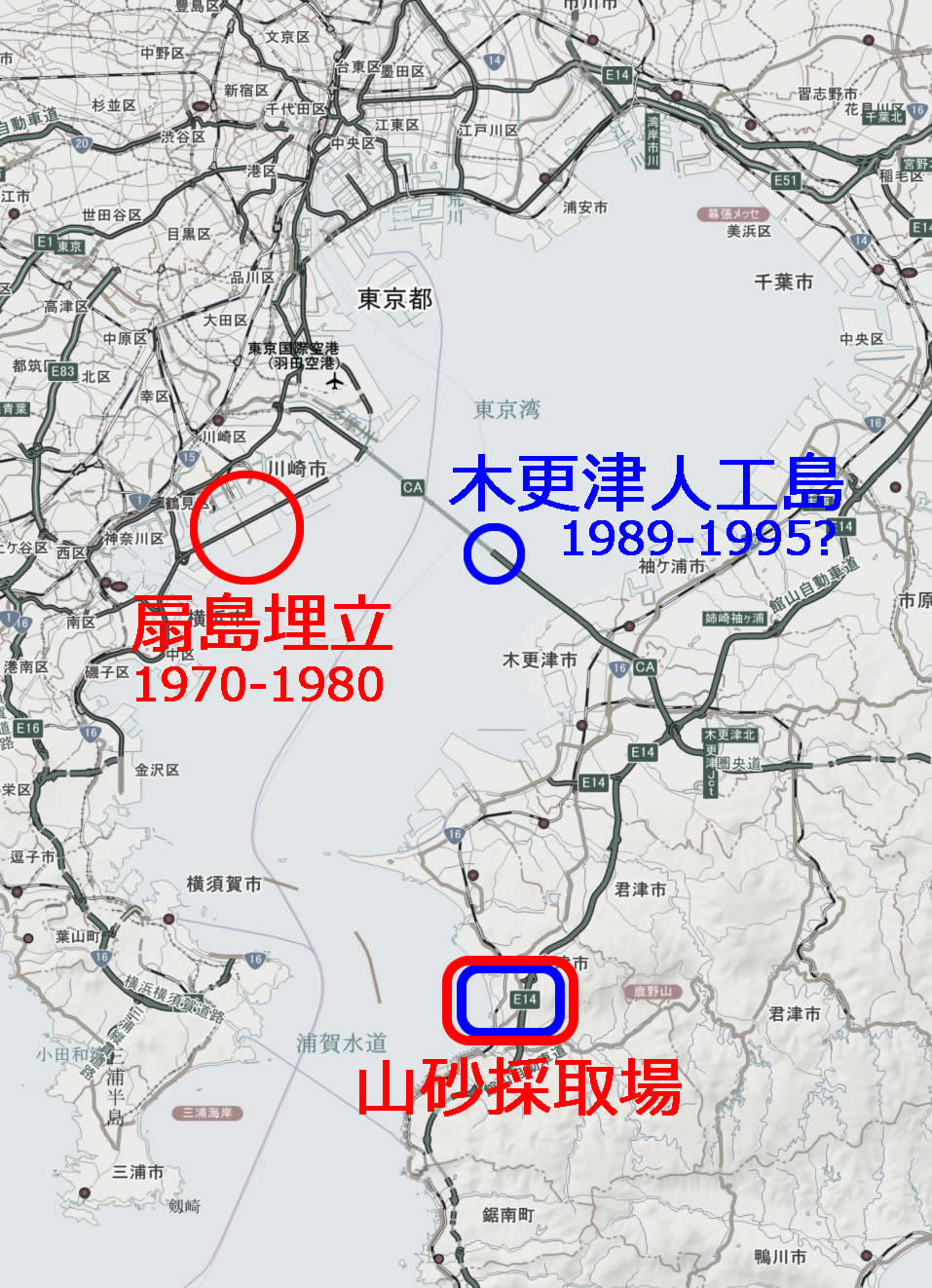東京湾観音が立つ富津市(山砂業界の元締めH・K代議士の地元)の一角にあった浅間山(標高約200m)は、1971年から対岸の日本鋼管扇島製鉄所の埋め立てに使われ、山が消えた。東京ドームが200個入るという採取現場は、環境破壊防止を理由に、80年から採掘停止を命じられていた。だが、東京湾横断道路の工事とともに89年から再び採掘が始まった。浅間山の後背地のマザー牧場のある鬼泪山北端は国有林が一時解除され、横断道の人工島建設用土砂に利用することになった。かつて、扇島に山砂を運んだ長さ4kmの2本のパイプラインは、また新たな山砂を履き続けている。