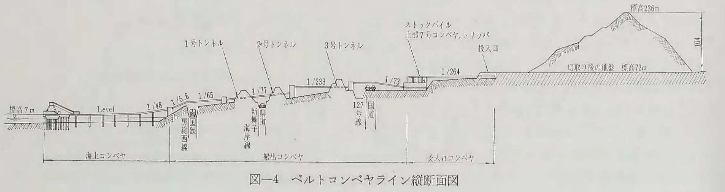 コンベヤルートは大容量高速の運転に際し、公害防止上の見地からなるべく民家地区を避けた場所を選定したが、土地買収上からも制約があり、A系統では比較的直線コースが確保でき、長尺コンベヤの特徴を発揮できたが、B系統では途中トンネル貫通部3個所、屈折点3個所を通るルートになった。(中略)