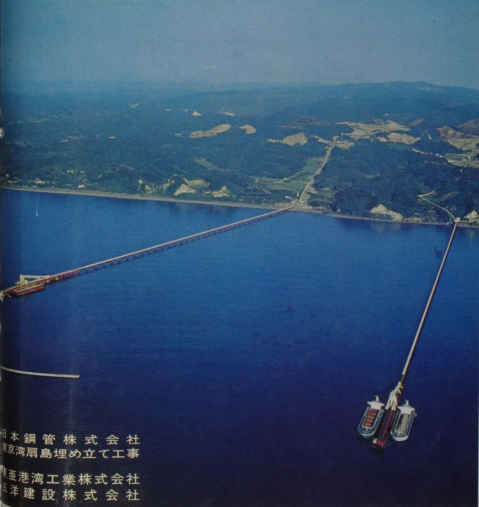 扇島の埋め立ては、日本鋼管(株)京浜製鉄所の集約更新を図るため、現扇島前面516万平方メートルを造成する工事で、所要土量約7000万立方メートルを千葉県富津市浅間山付近から、大容量ベルトコンベヤ2系統により搬出し、大型土運船を海上輸送に就航させ、バージ投下、ポンプ船による再揚土の工法を用いて埋め立てを行なうものである。