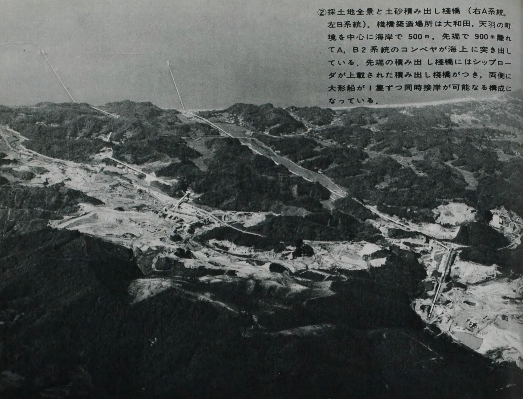 採土場全景と土砂積み出し桟橋(右A系統、左B系統)、桟橋築造場所は大和田、天羽の町境を中心に海岸で500m、先端で900m離れてA、B2系統のコンベヤが海上に突き出している。先端の積み出し桟橋にはシップローダが上載された積み出し桟橋がつき、両側に大型船が1隻ずつ同時接岸が可能なる構成になっている。