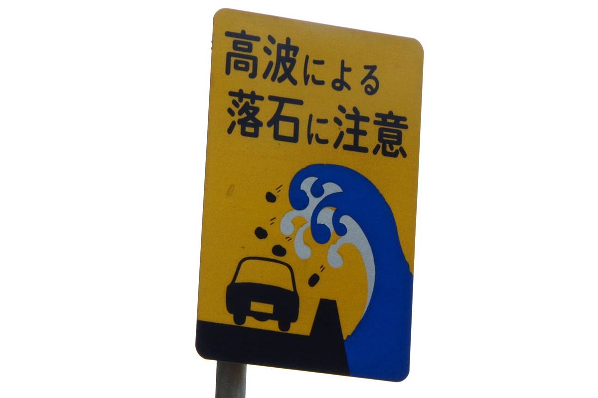 同じ日本海でも遠く離れた佐渡島での経験ではあるが、右写真のような道路標識が設置されているのを見たことがあるので、冬の日本海が時として海底の岩塊を“落石”に変えてドライバーにぶつけてくるほどの暴威を見せる事への真実味は感じているところだ。
