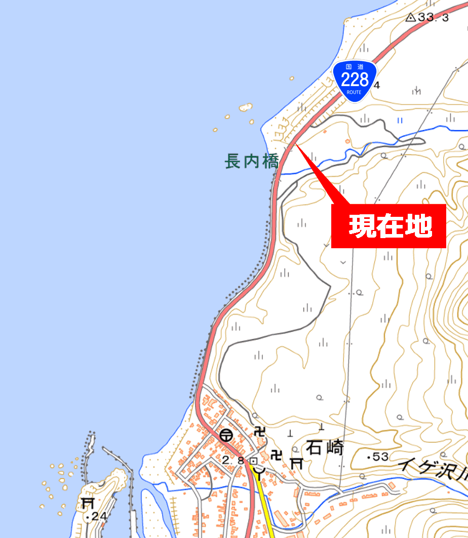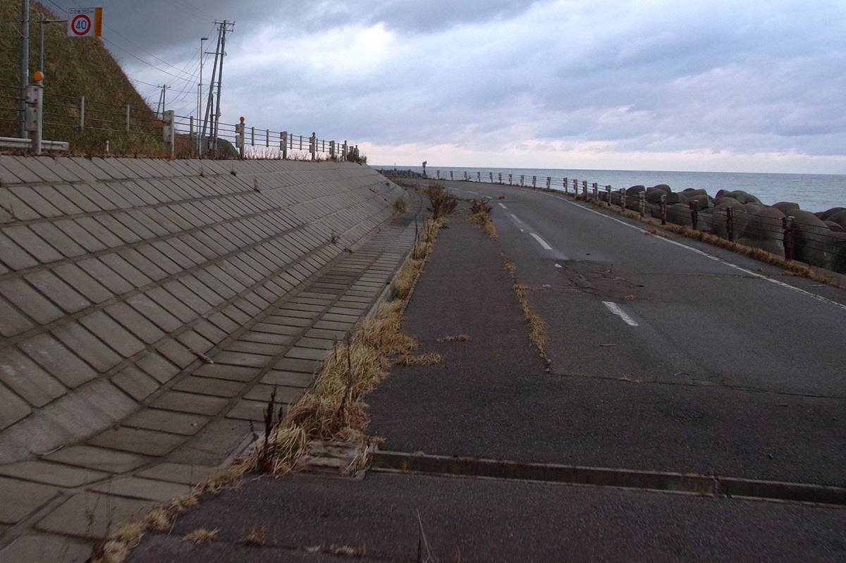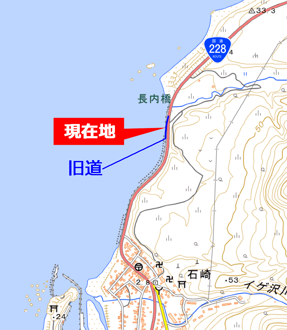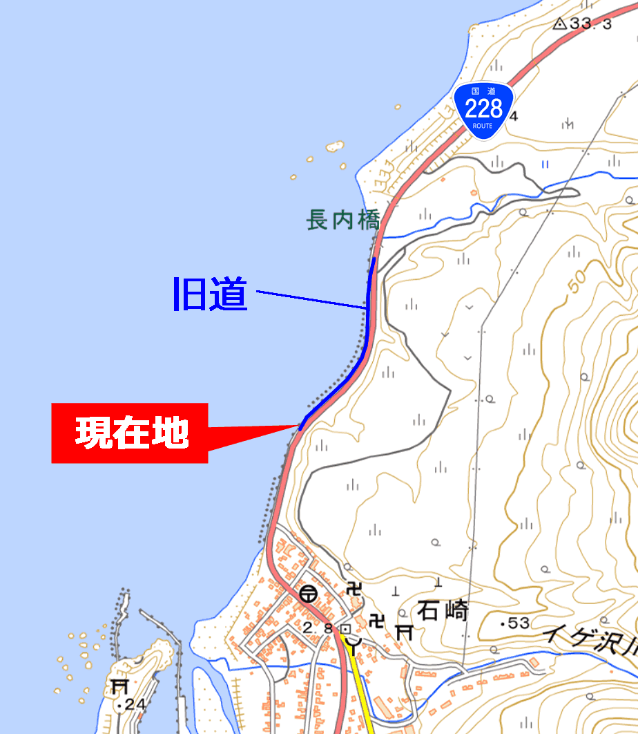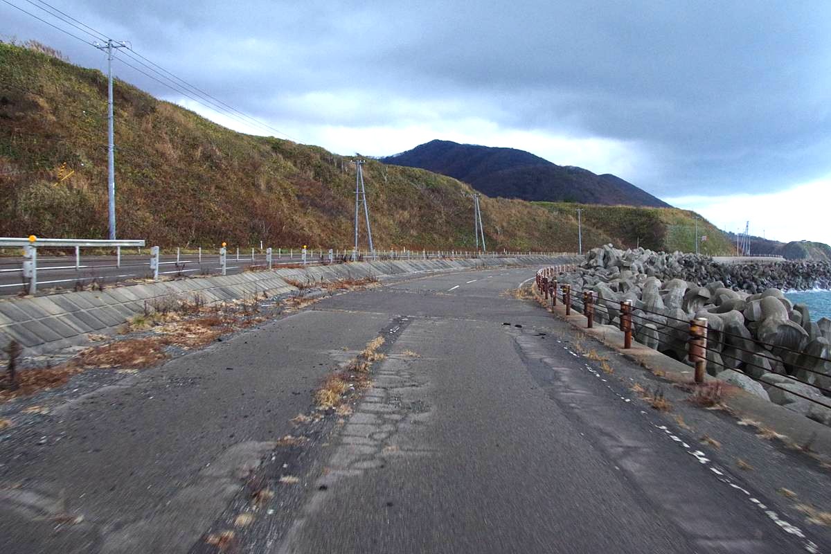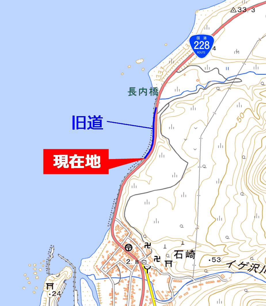国道228号は海岸沿いの区間が多い道路だが、今回探索個所は、その中でも特に越波による問題が顕在化していた場所なのだろう。