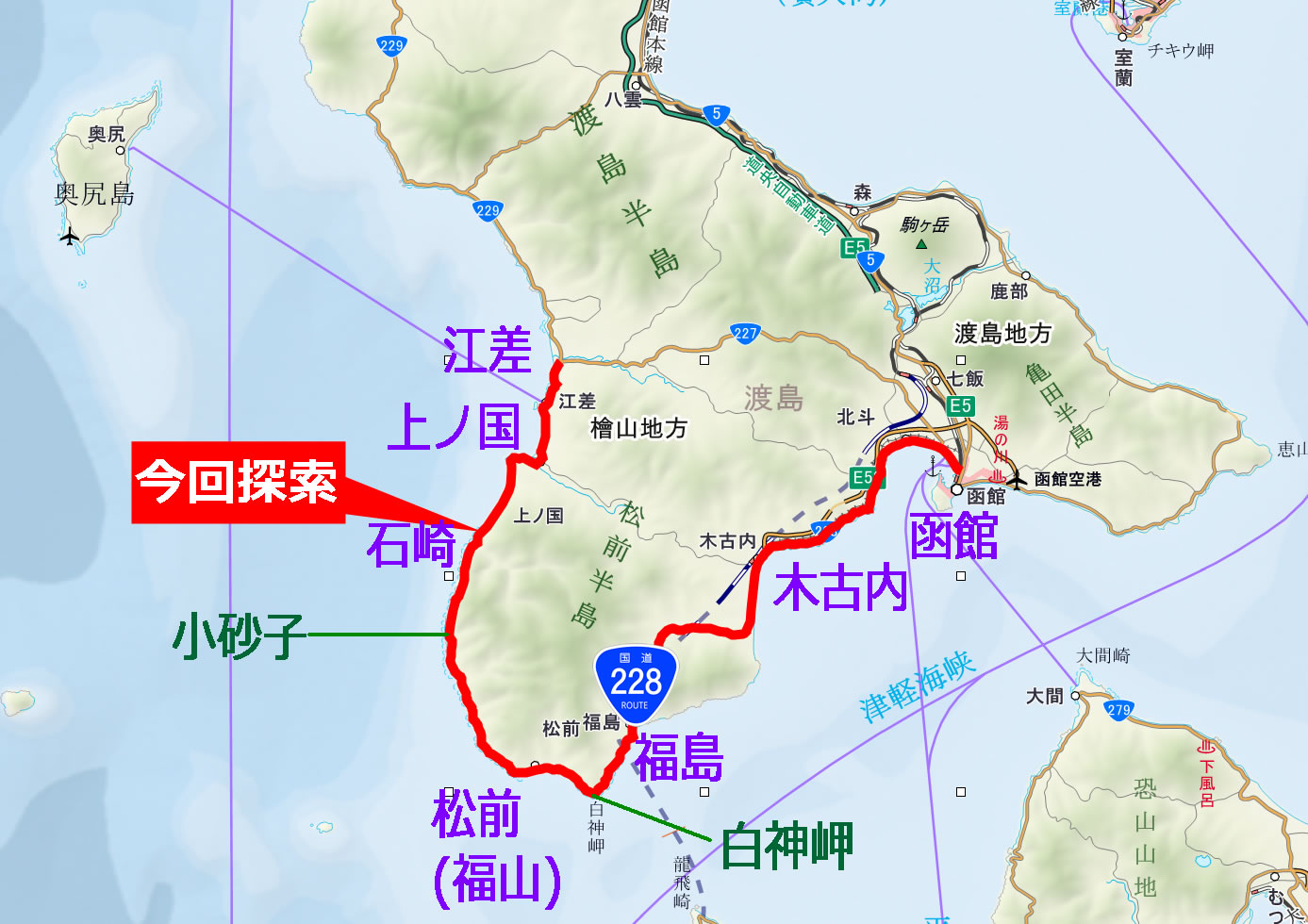 とはいえ、この石崎地区個別の事情についてはほとんど全く情報がないので、松前半島を巡って函館市と江差町を結ぶ国道228号および、その前身となった路線の全体史から、周辺の事情を取り上げることにする。