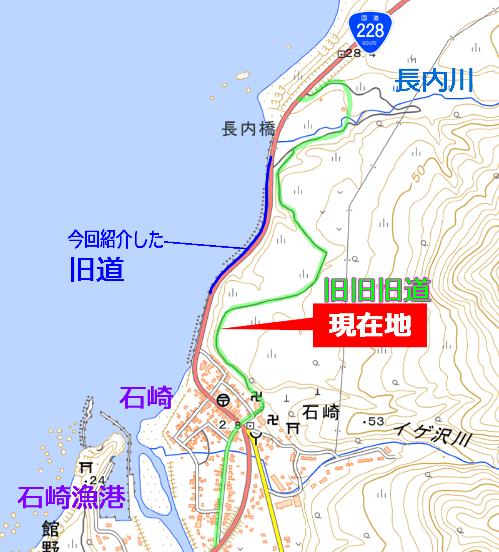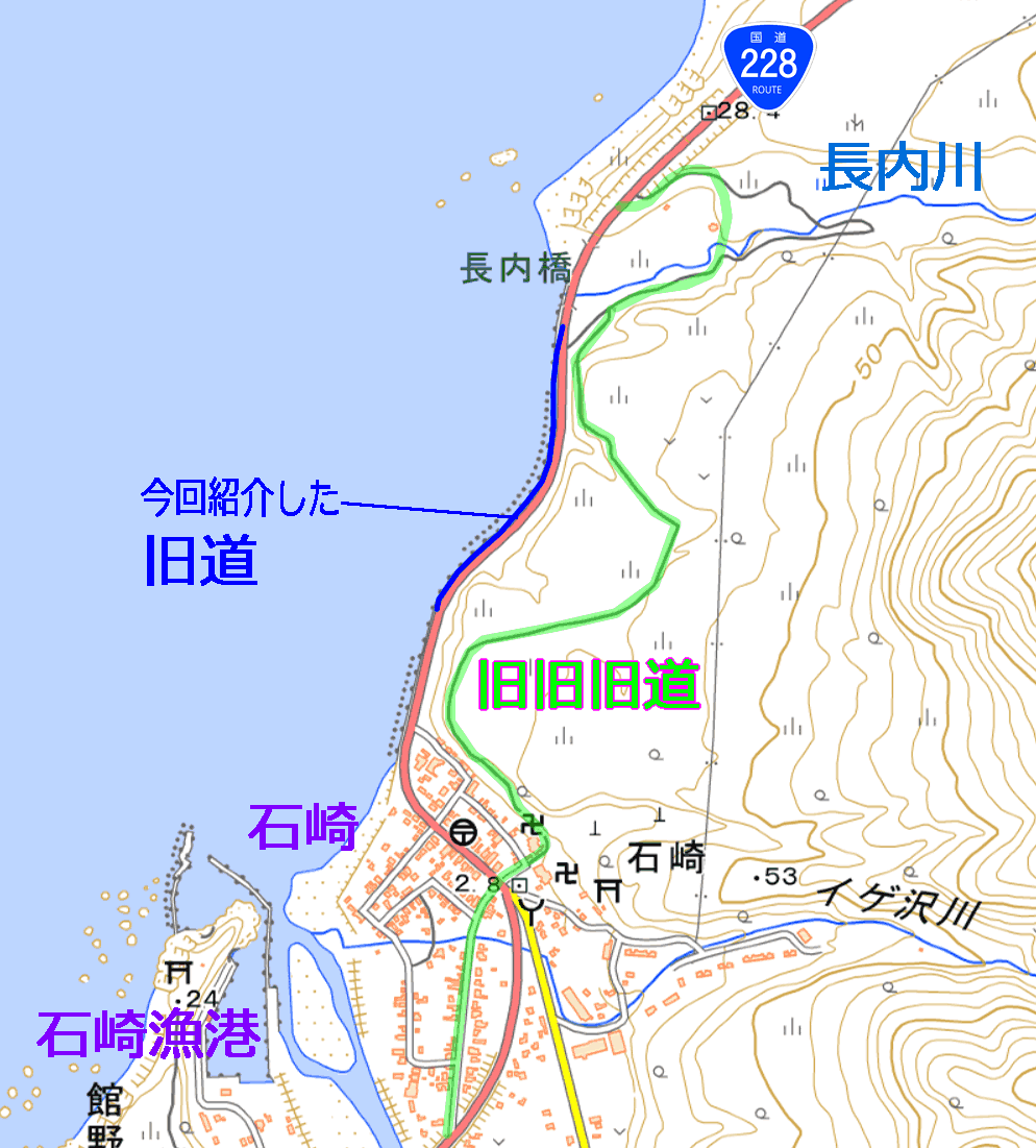 何の変哲もない海沿いの快走路である。旧旧道については既に痕跡程度だが、丘の上の旧旧旧道は、結構鮮明である。