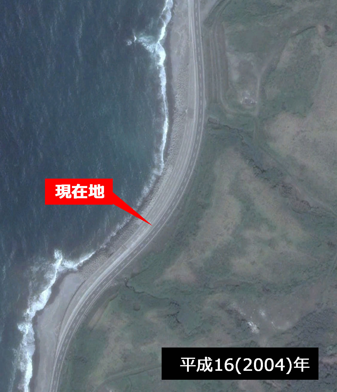 「この国道区間は、これまでの越波対策のために道路の線形改良を行いましたが」とあることで、本編中に推理した“越波対策”という道路の付け替えと嵩上げの目的が確かであったと裏付けられた。