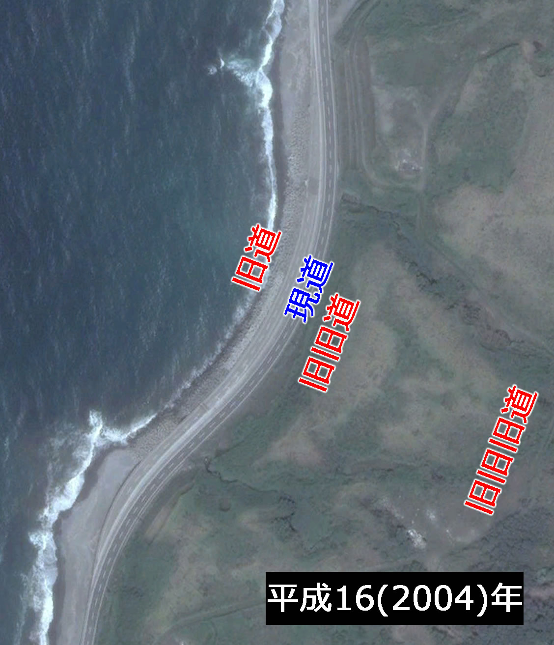 チェンジ前の画像が平成16(2004)年版で、今回探索した通り、まるで4車線道路のように現道と旧道が海岸線に並行している。