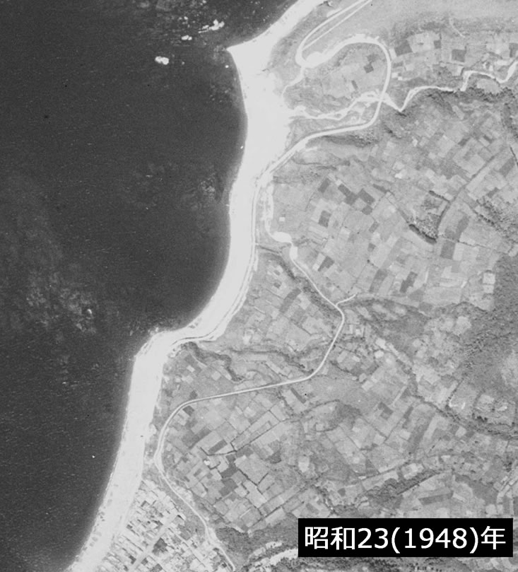 国道のルートが今と違っている。特に長内川を渡る橋の位置が大きく内陸側に寄っている。これは@の現道から見た旧旧道である。そしてこの旧旧道敷、現道の用地として一部は再利用されている。また、砂浜を埋め立てる直線的な「工事中の道路」が表現されている。これがAに描かれている国道だ。ちょっと直線は強調されすぎているが。