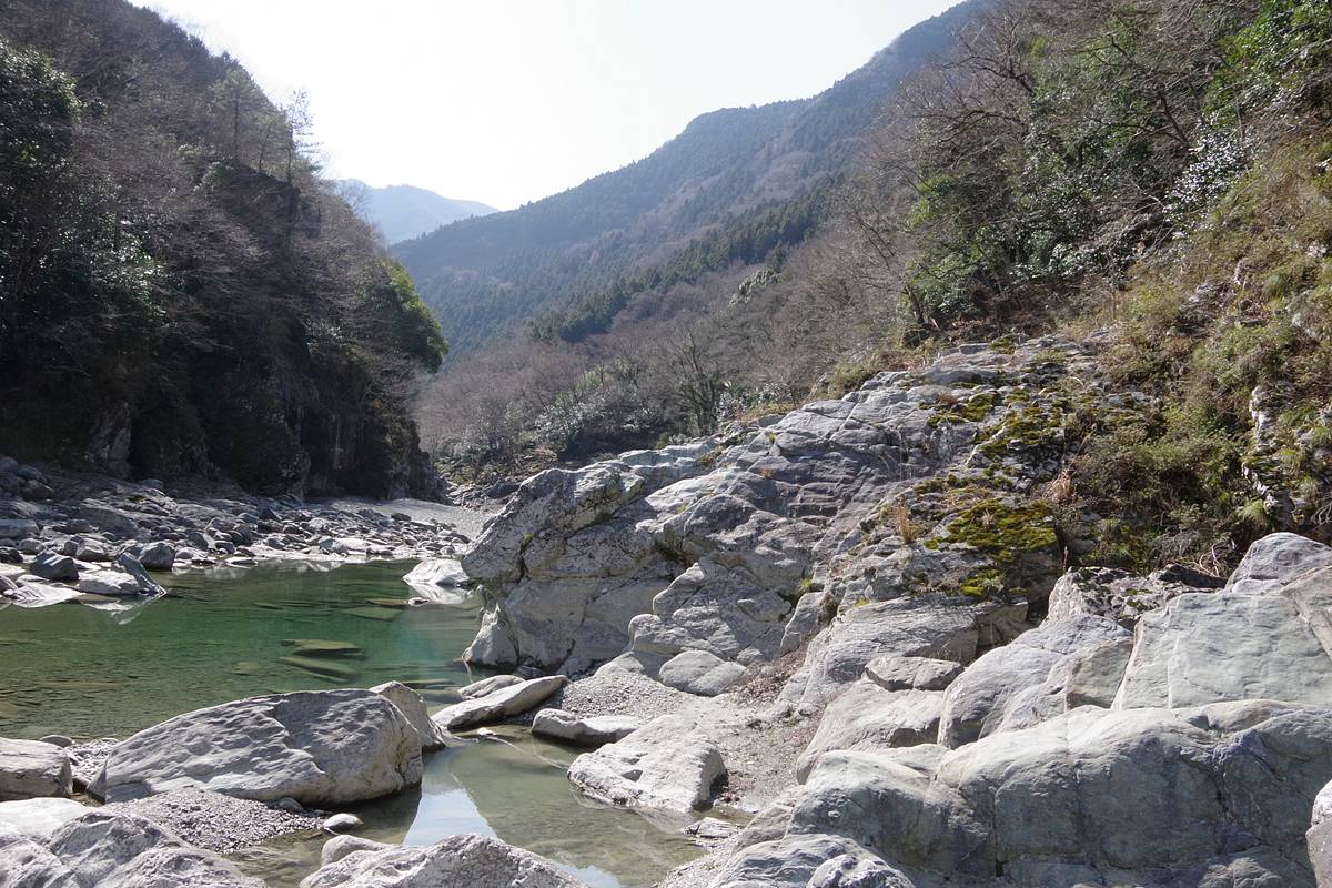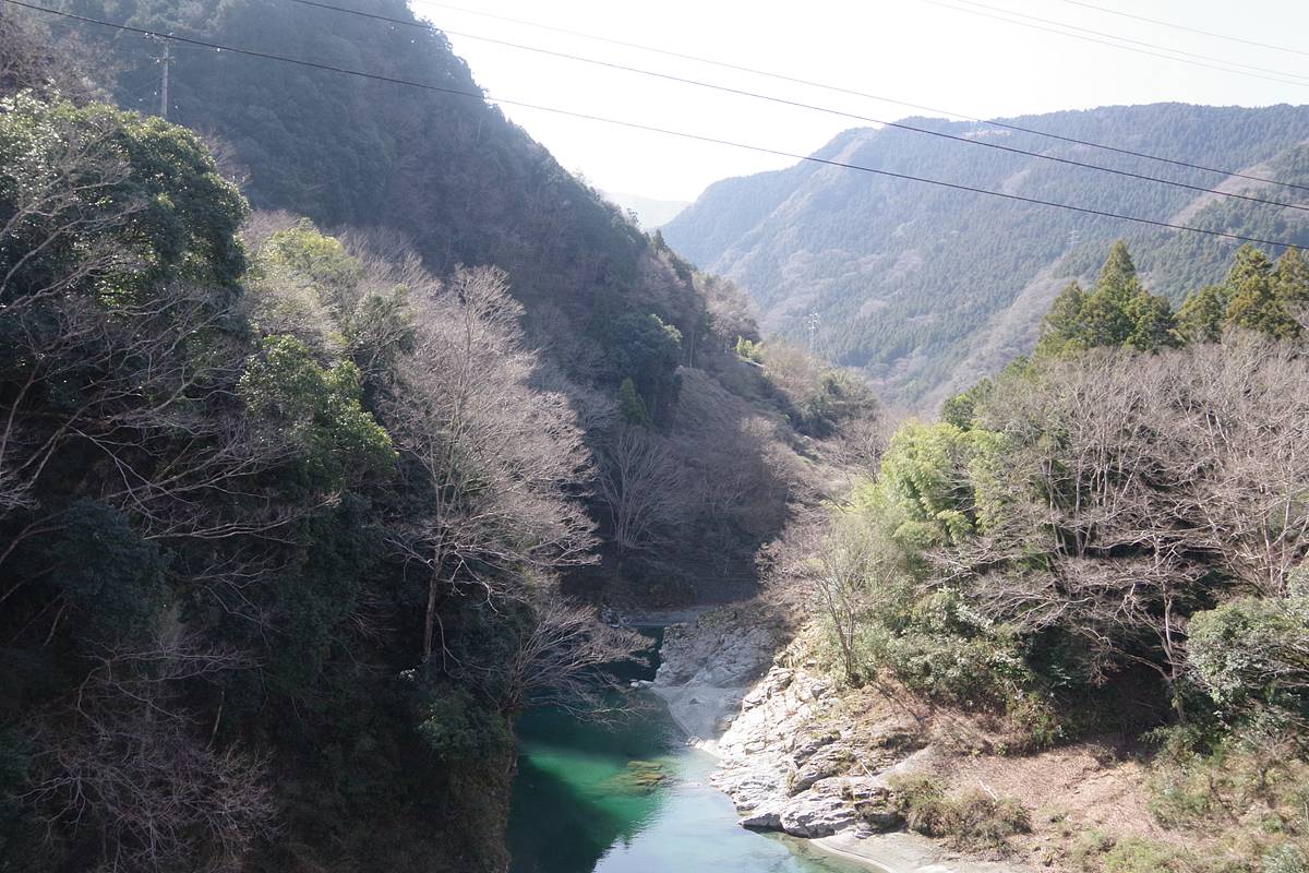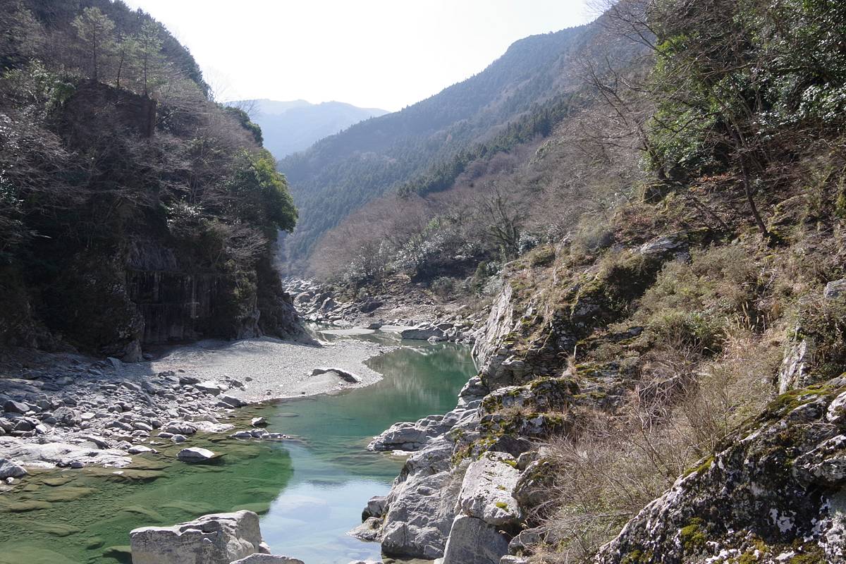 いきなりズームレンズで数百メートル先を撮影したので、橋の近くにある広い河原は完全にフレームアウトしているが、この写真の辺りから既に岨谷峡と総称される、祖谷川らしい峡谷風景が始まっている。