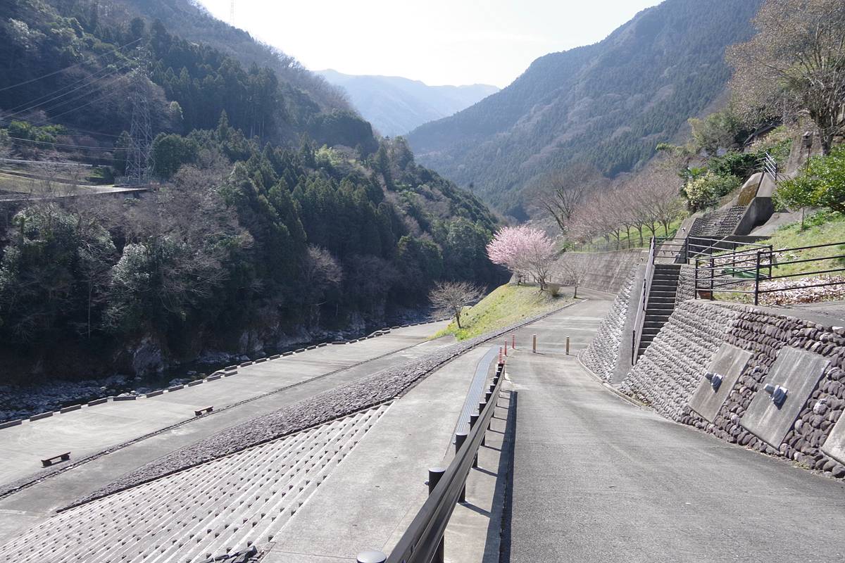 しかし、この場所で実際に目立っている構造物は、川崎集落のある左岸側の川岸を水流から30m近い高さまでガチガチに守るコンクリートの護岸である。その巨大な護岸の随所に階段やベンチなどが設けられていて、平時は親水公園として機能するようになっている。それが川崎床固工の実態であった。