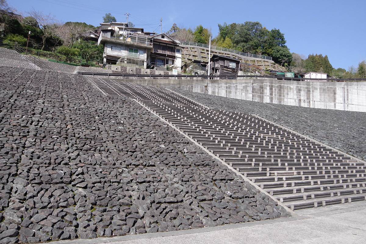 この施設は川崎床固工を名乗っているが、一般に床固工とは川底を横断するように設けられた護岸ならぬ“護底”のための構造物で、これにより河床の洗掘を防ごうとするものだ。