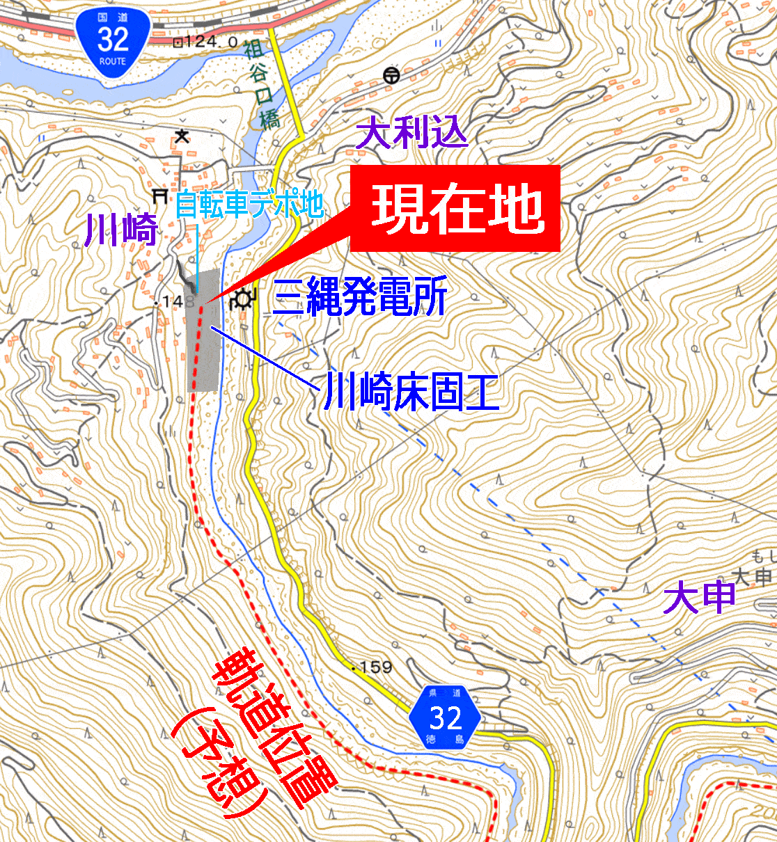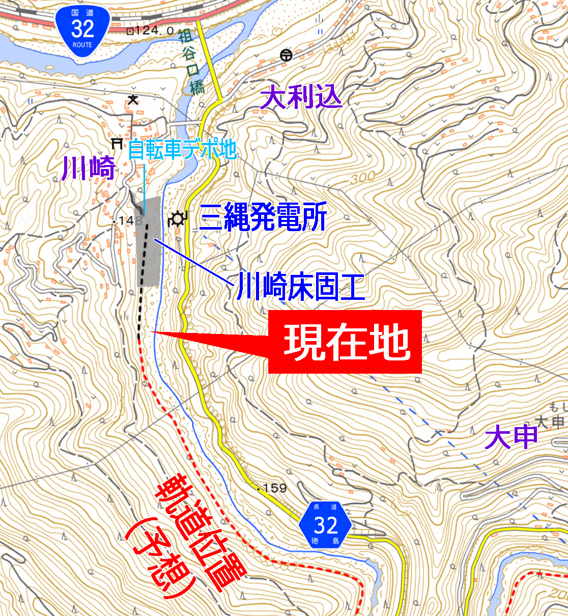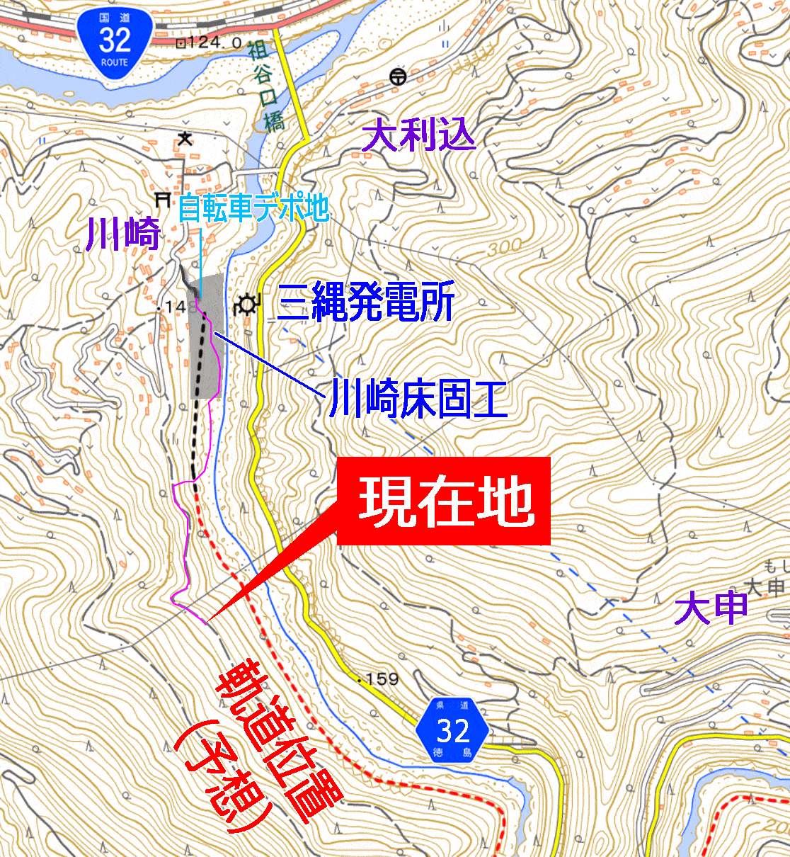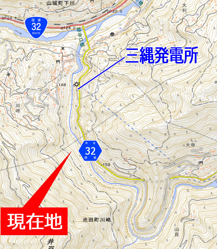 いま私は、上図の「現在地」の位置(三好市池田町大利込)にいる。