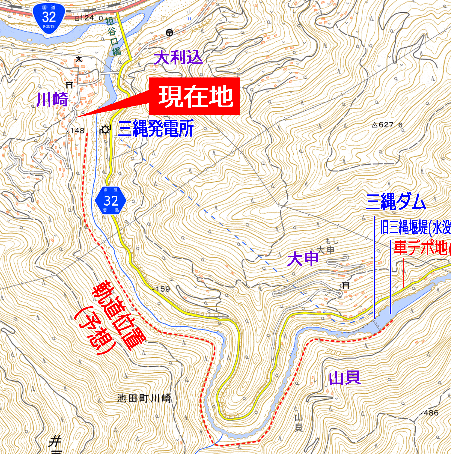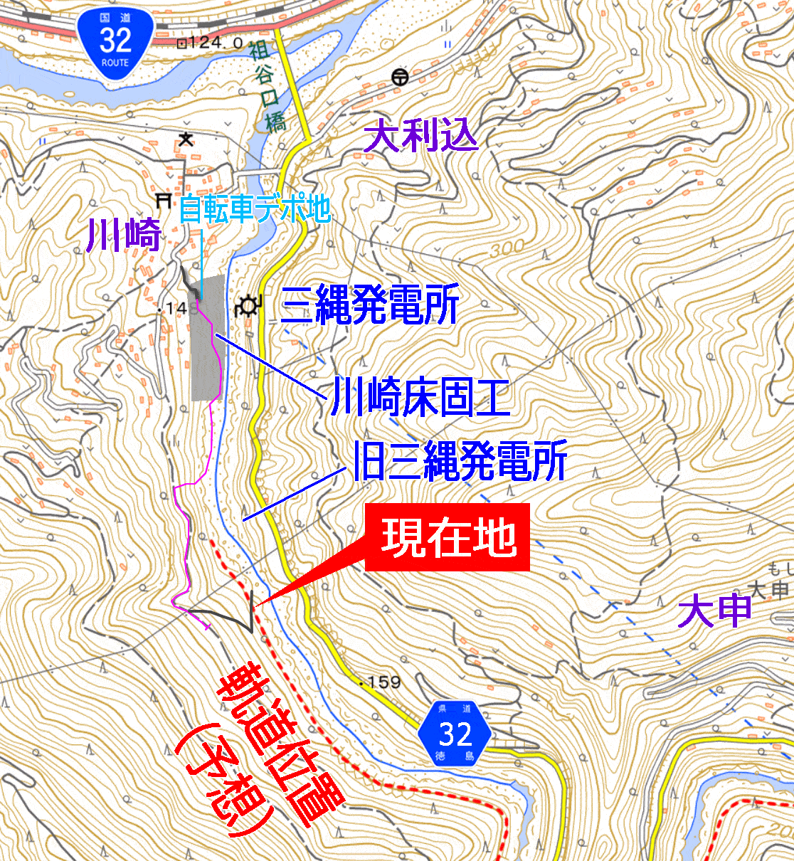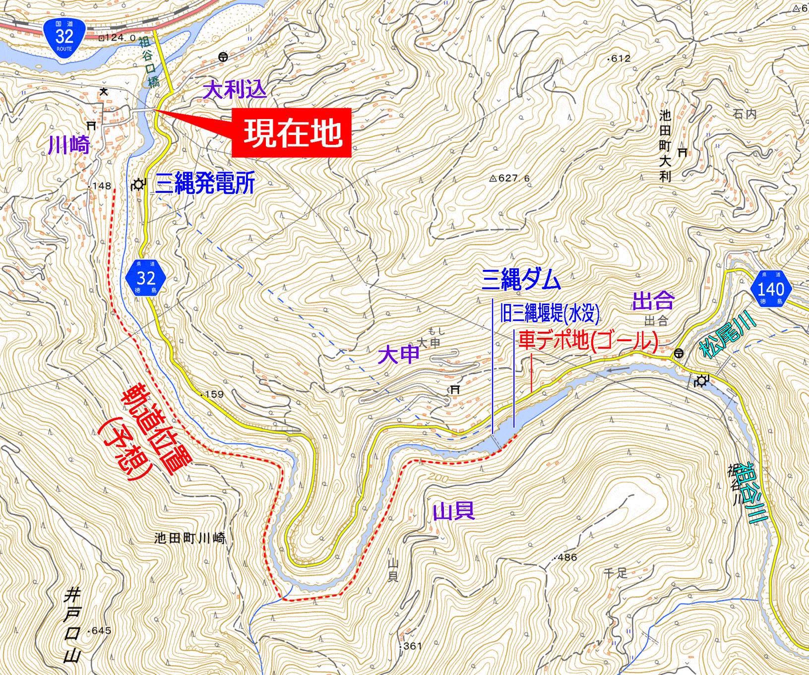 いま私は、上図の「現在地」の位置(三好市池田町大利込)にいる。