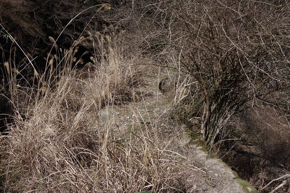 右の川側にカーブした石垣が続いていることはすぐに気付いたが、その数秒後に、山側にも低い石垣があって、つまりは両側が石垣の築堤路であることが判明した。