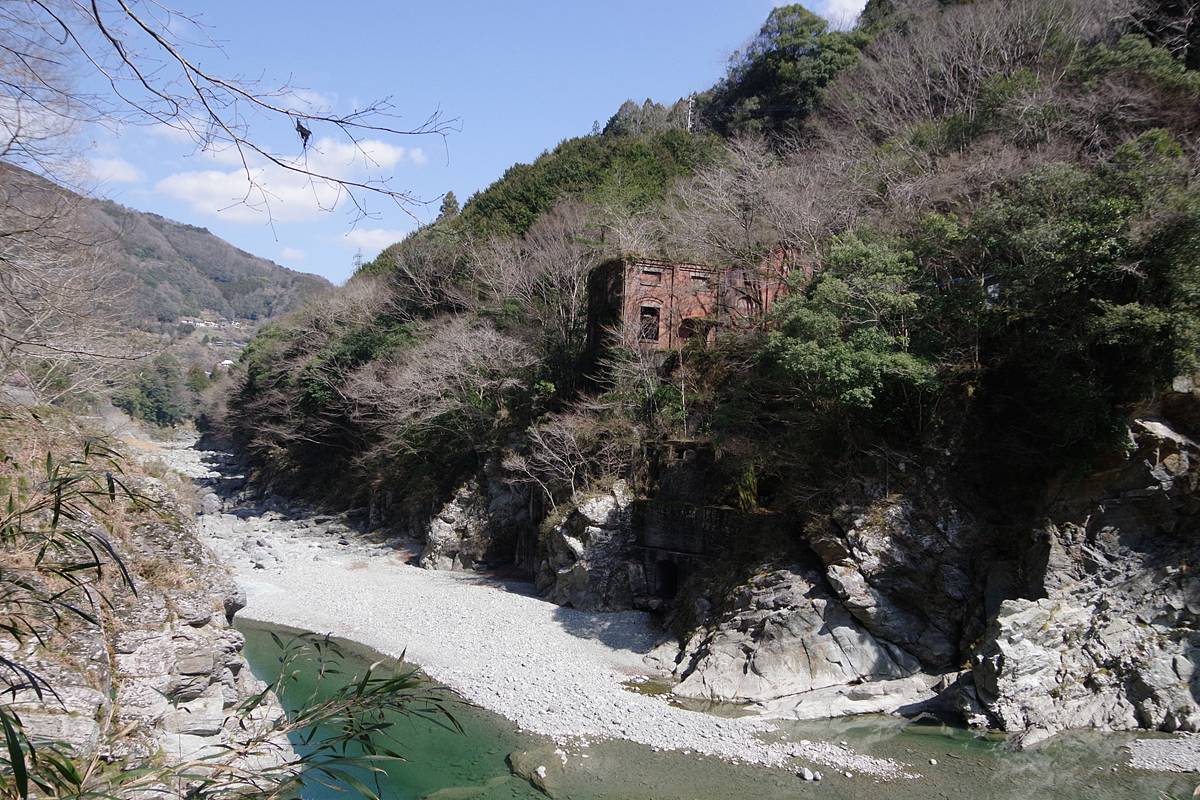 なお、これは今から約35分前の10:19に、先ほどの地図に★印で示した位置にある大岩の上から上流方向を撮影した写真だが、ちゃっかり旧三縄発電所の煉瓦造りの重厚な建造物が写っていた。