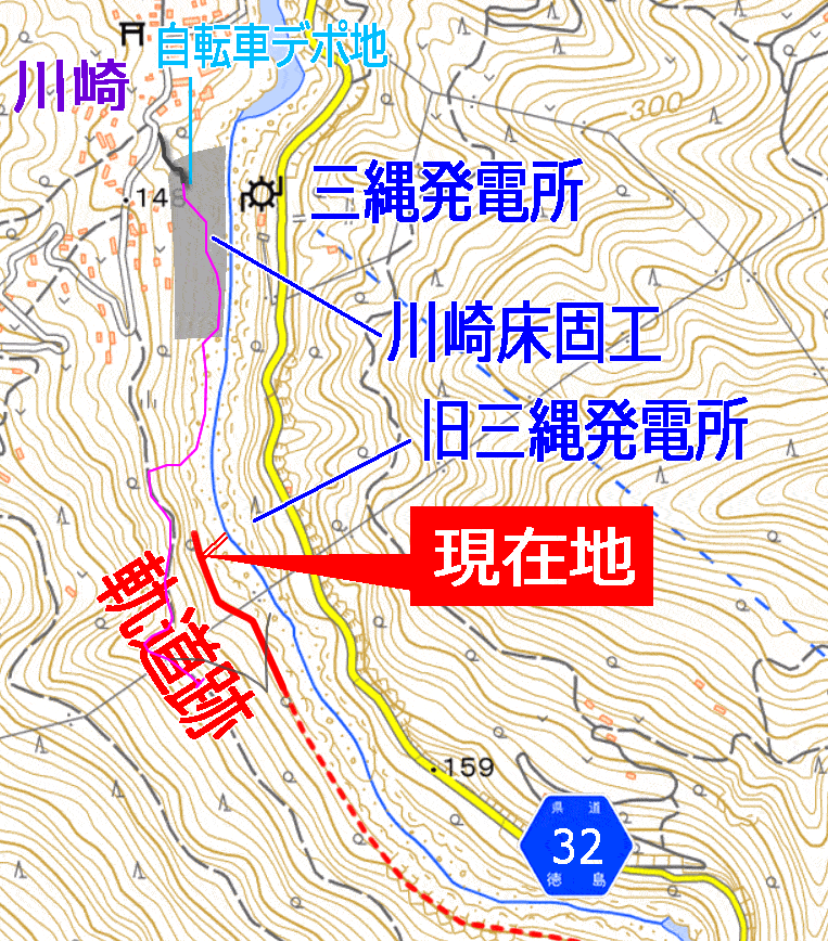 いささか消化不良を起こしそうな、唐突かつ手狭な起点?終点?であったが、GPSで現在地を確認してみると、まさしく(地形図には描かれていない)旧三縄発電所の真っ正面(対岸)であり、『西祖谷山村史』の記述は全面的に正しかった。