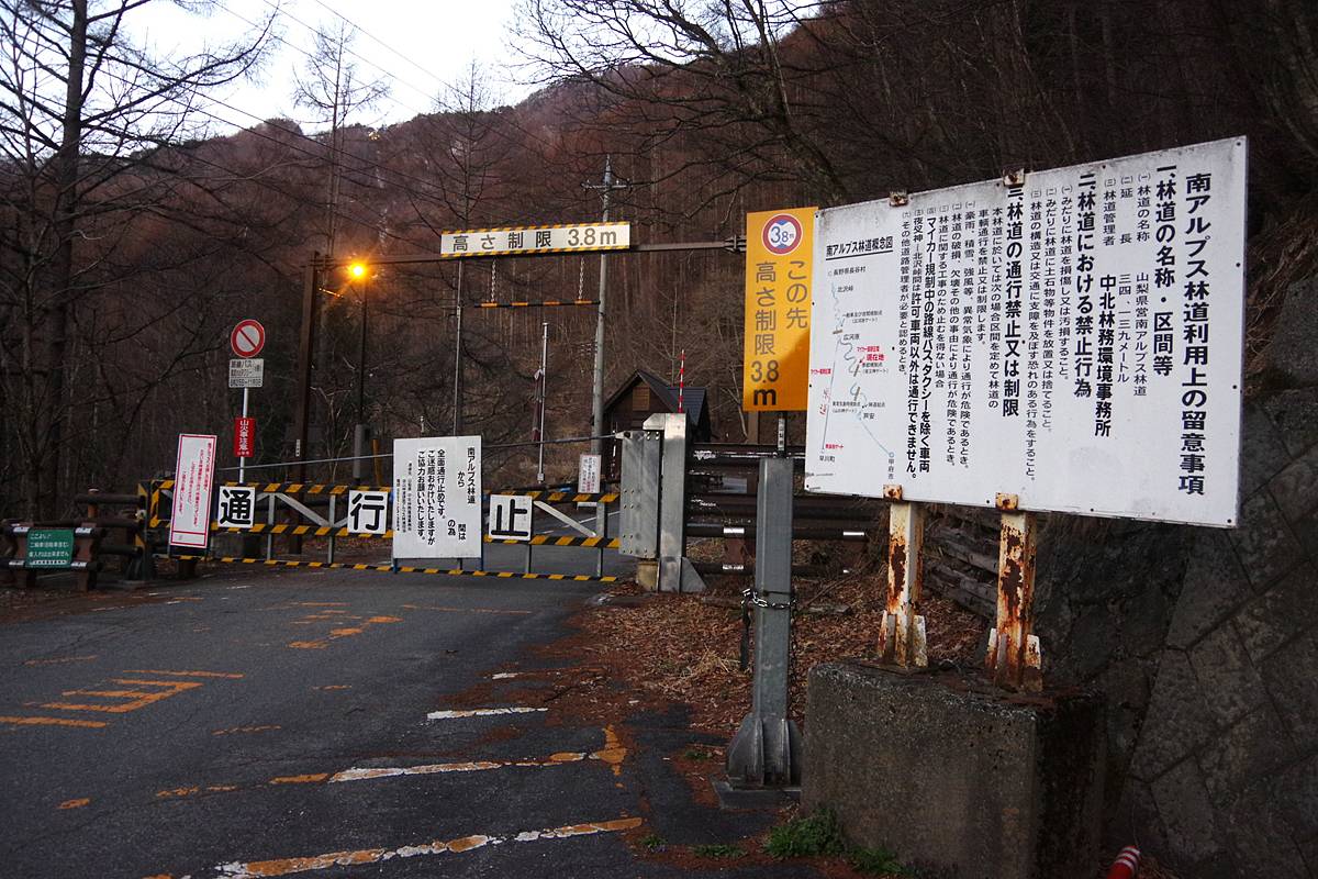 情報を要約すると、この先の南アルプス林道は通年において一般車両は(自転車含め)通行止であり、かつ今は冬季閉鎖期間中である。