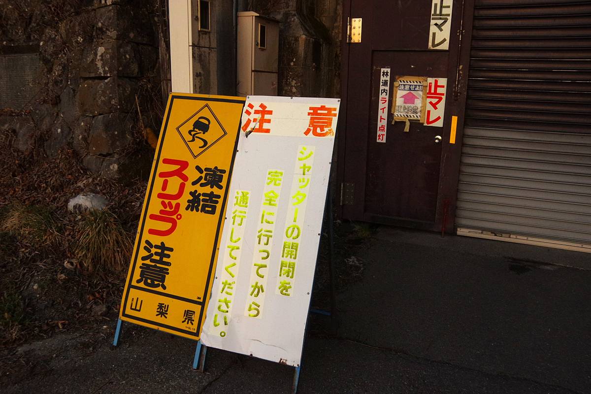 大量の看板たちの中央には、ゆるキャン△にも登場した厳重な通行止のゲートが当然のように閉じていた。