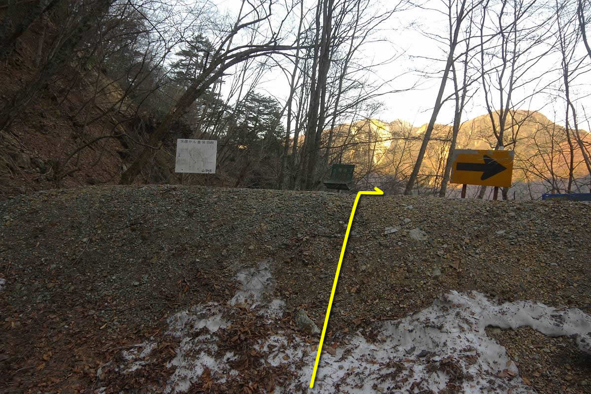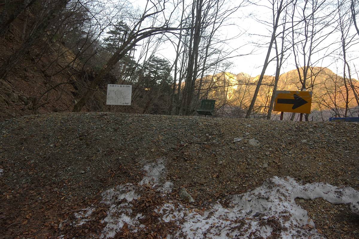 アルピニストが残した無人の車が数台静まりかえっている駐車場に、息せき切って私が登場。