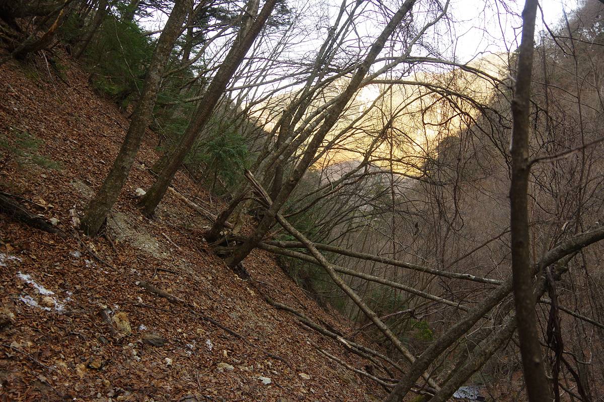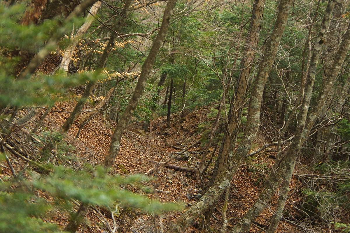 周囲は踏み跡などないガレ場や落葉で潤滑された急斜面ばかりで、どこを下ろうにも気楽ではない。