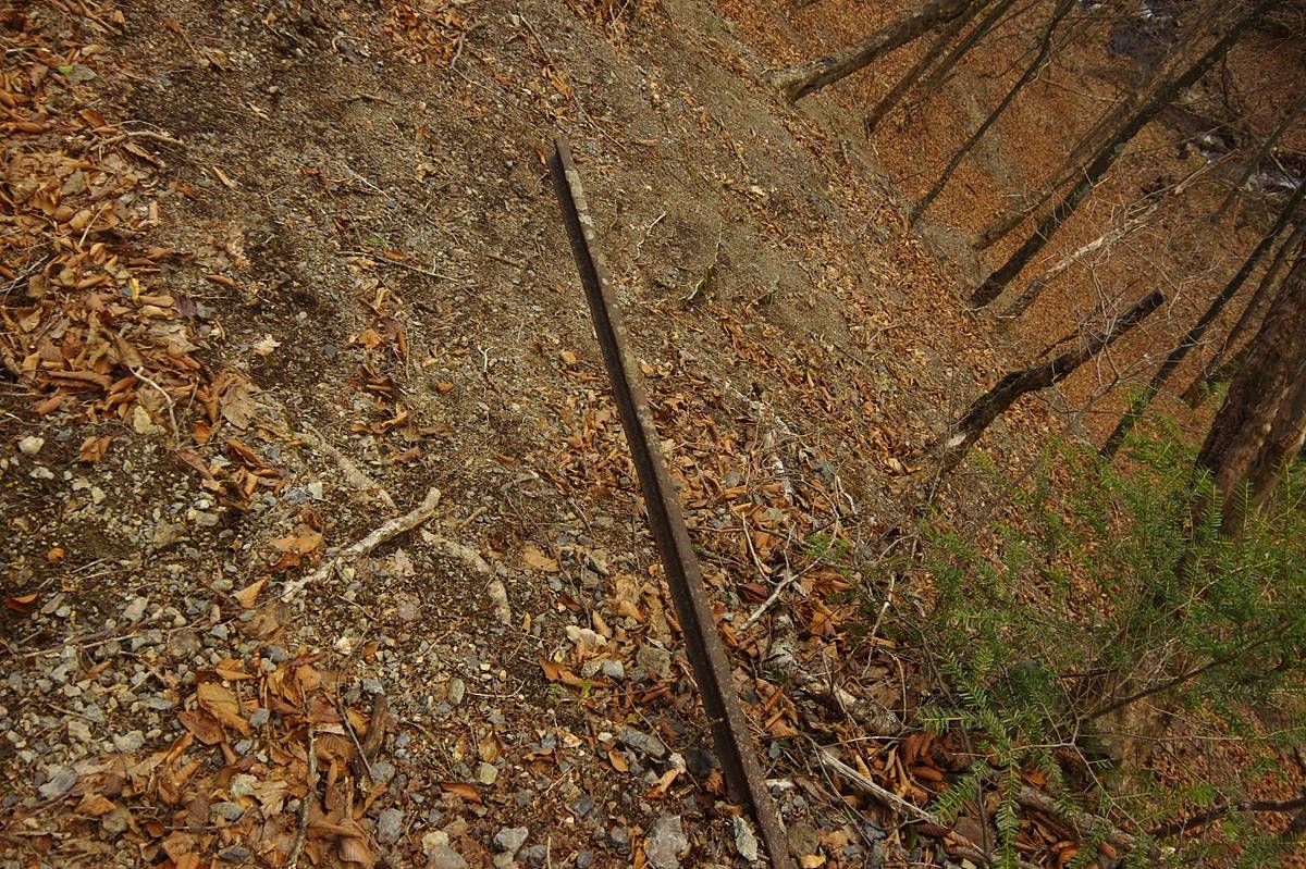 今のところ軌道跡は見当らないが、斜面にはときおり、林道から落ちてきたらしき人工物の残骸が散らばっていた。