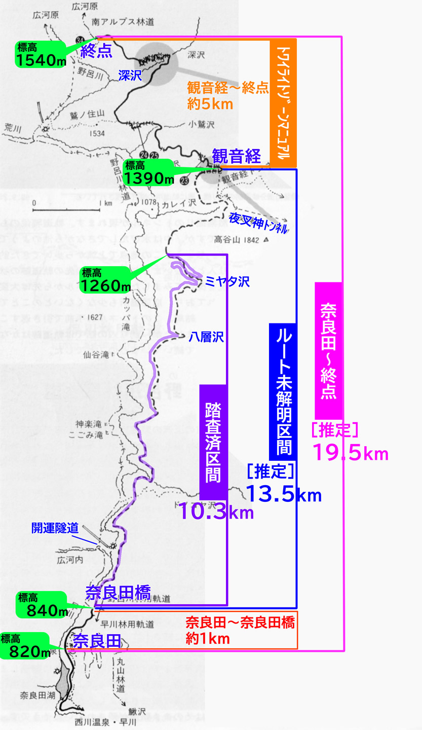 早川林鉄の奈良田〜深沢終点間推定19.5km(地図上の桃範囲)のうち、初日の探索を終えた時点で、トワイラ〜の未踏査区間推定13.5km(青範囲)の大部分である10.3kmが踏査済(紫範囲)となった。これが進捗の現状だ。