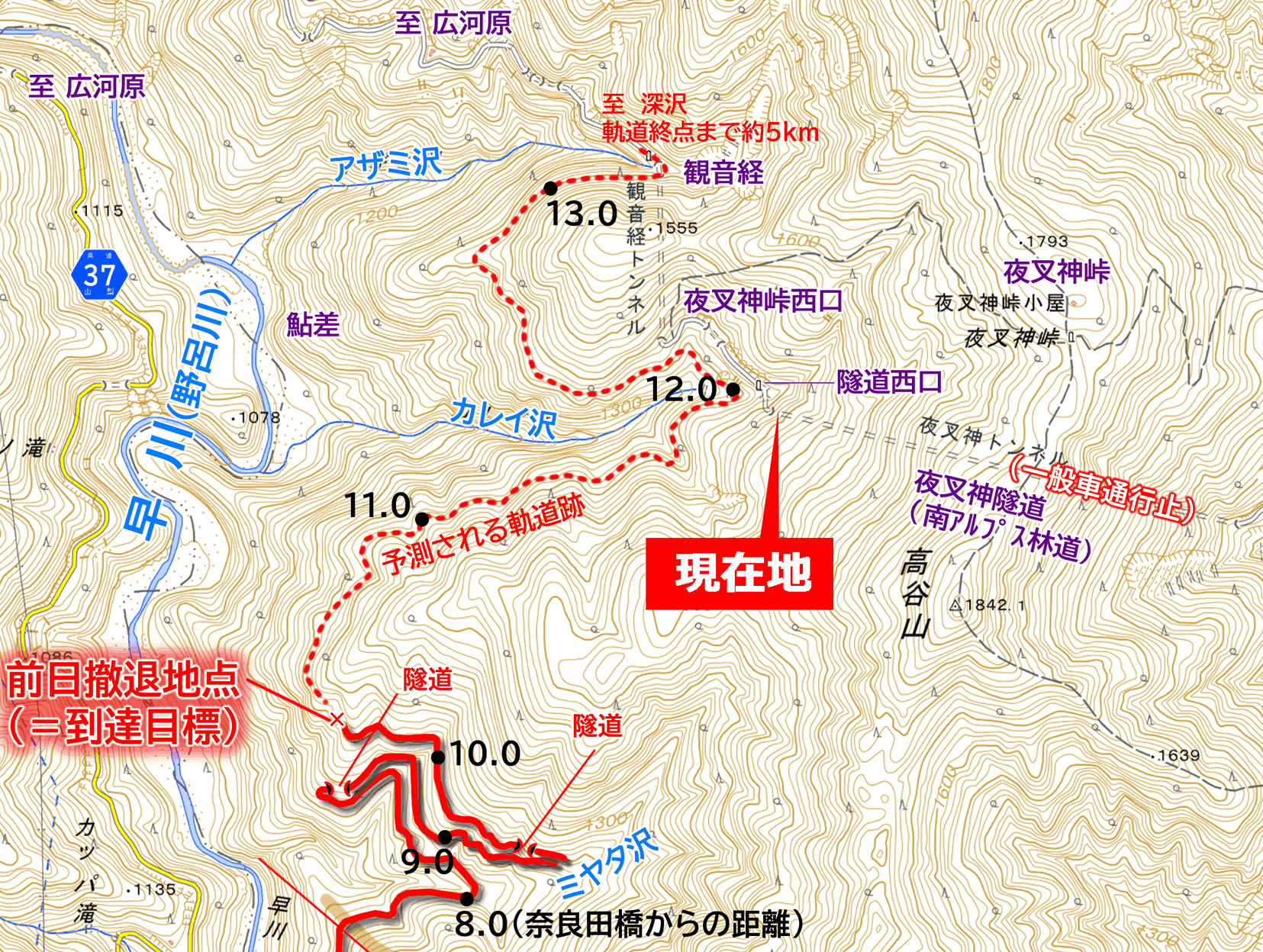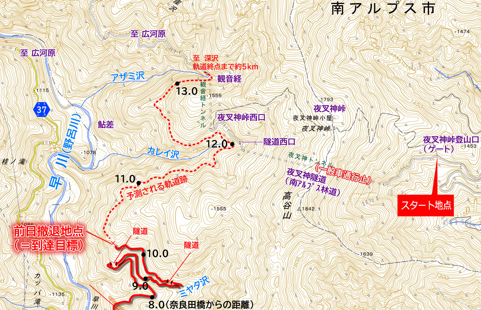 1日目の探索が最も順調に行った場合は夜叉神トンネルまで進行し、そこでそのまま夜営して2日目の歩行へ繋げる計画だった。
