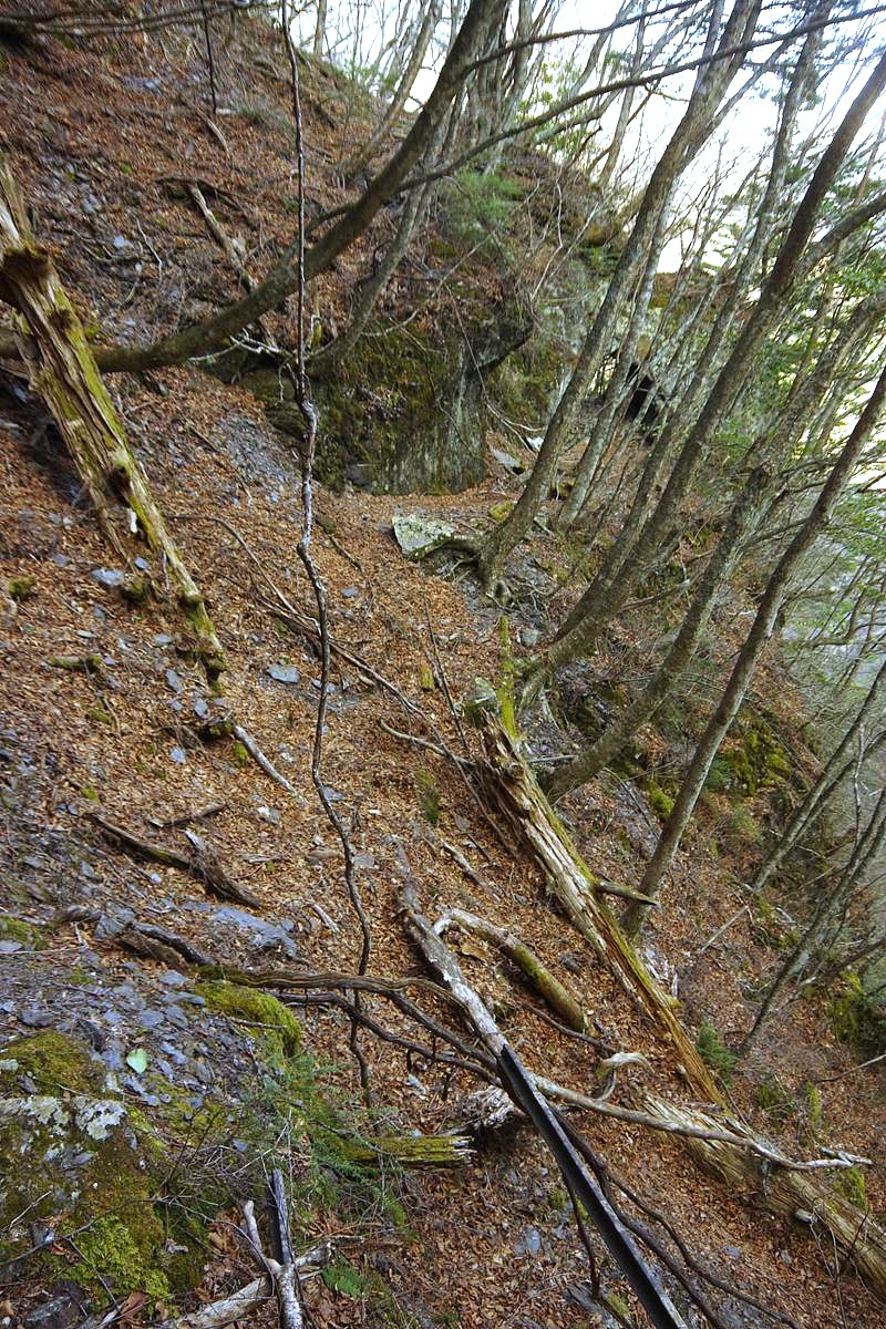 シカのように無鉄砲でも軽やかでもない私は慎重な足運びに時間を費やしたが、ともかく欠壊地の底まで下りることに成功し、その下ってきたところを振り返って撮影した。