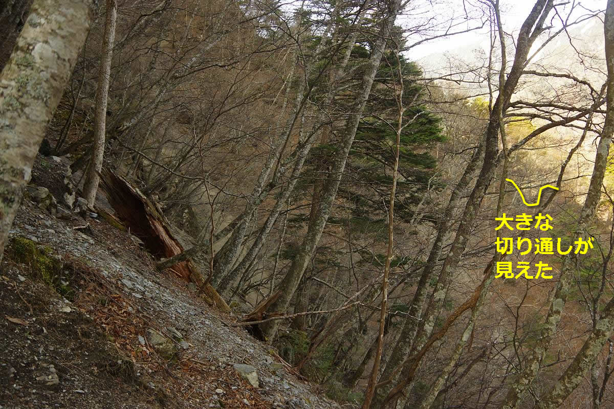 というわけで、隣の尾根を諦め、さらにその隣の尾根(高巻きAコース)までトラバースを継続することに。