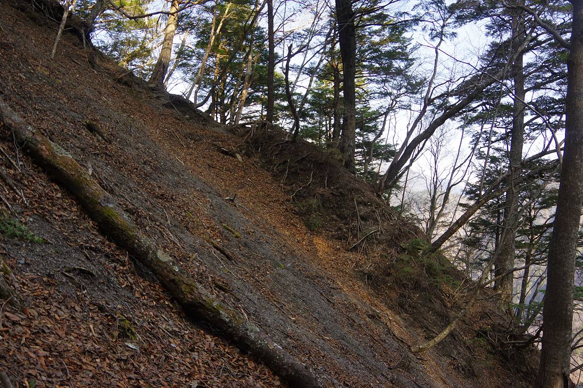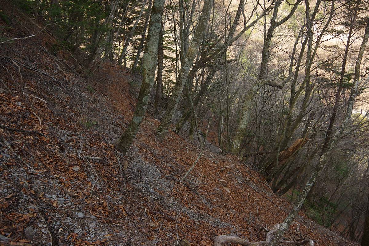 そのうえ予期した通り、滑りやすい砂礫質の硬く締まった斜面に乾いた落葉が乗っている状態で、登り始めてすぐに、これは大変だと理解した。