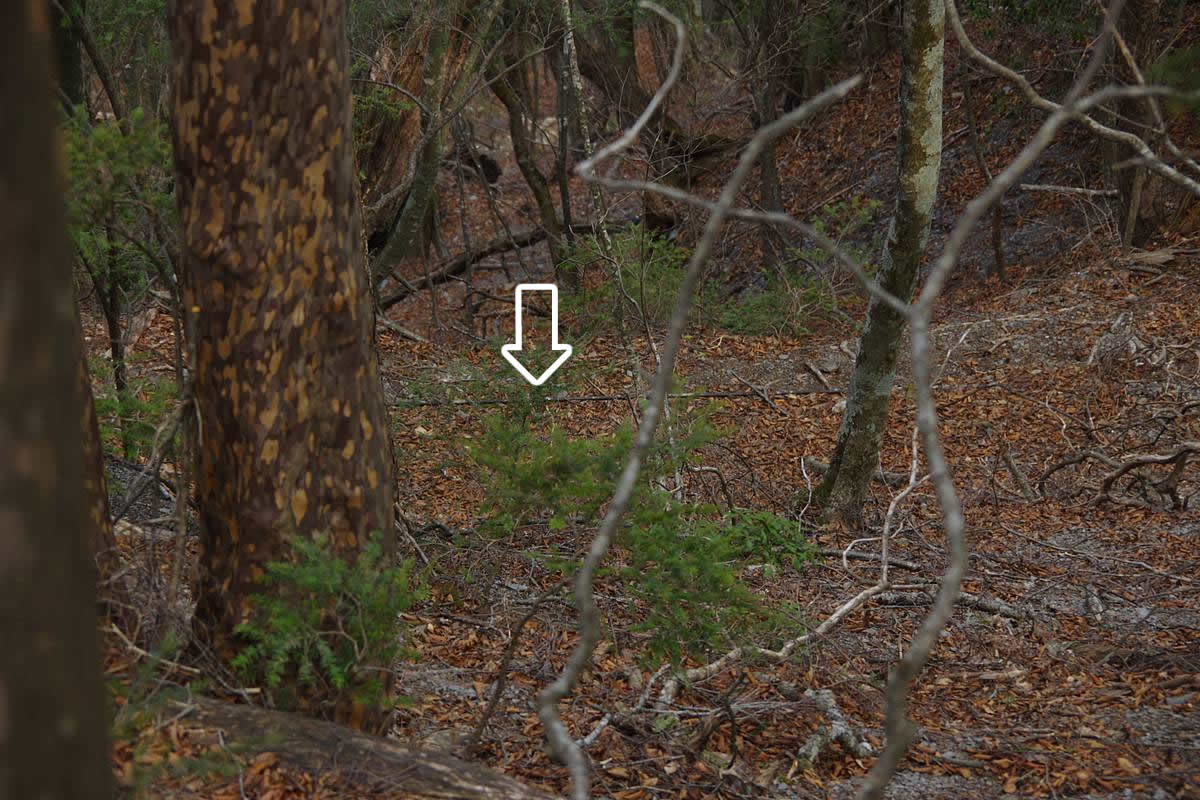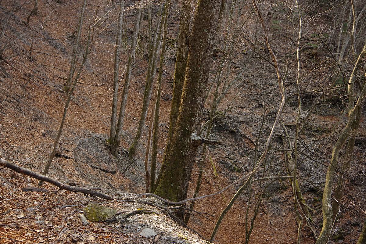 まだ隧道跡からよく見えていた近場の斜面だが、尾根伝いながら傾斜は急だ。