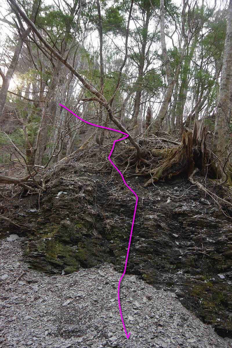 直上の尾根筋まで回り込む高高度の高巻きで、横断不可能な崩壊地は越せると思う。