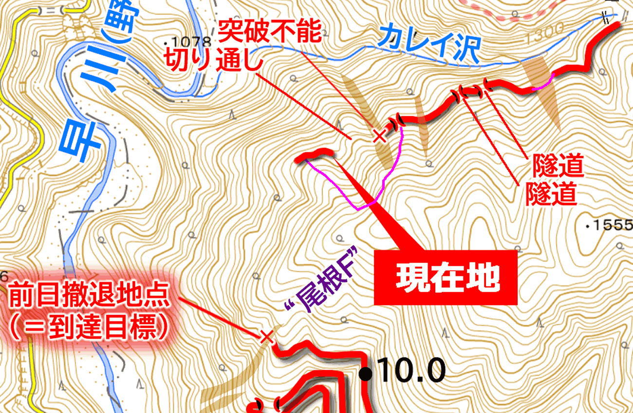 これにより、昨日の最終到達地点であり、本日最初の目的地である“尾根F”まで、残り600mに迫った。