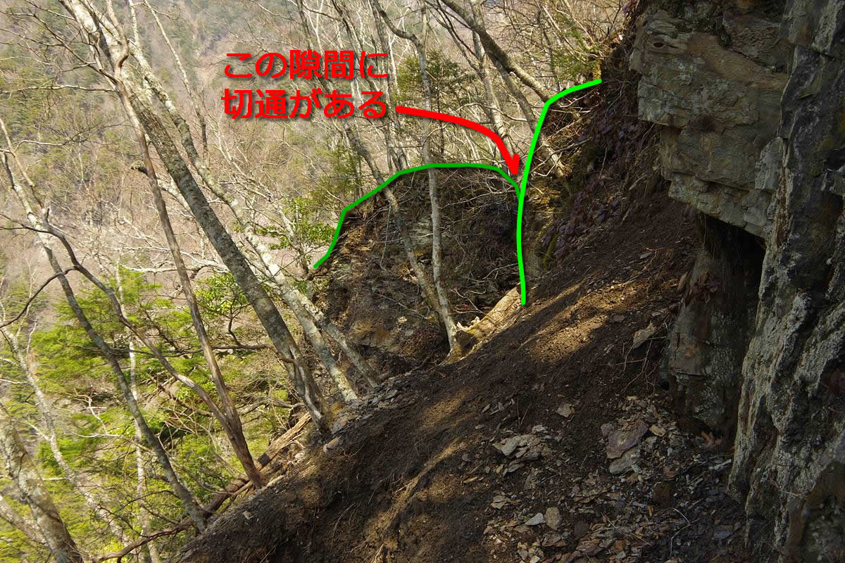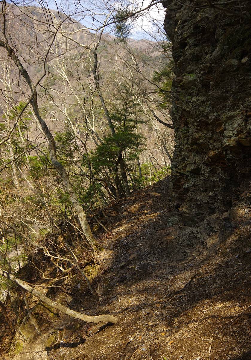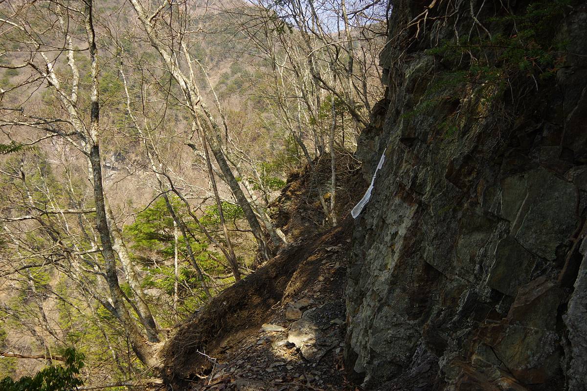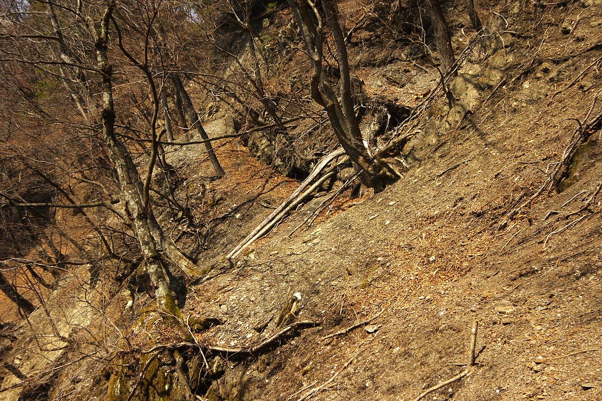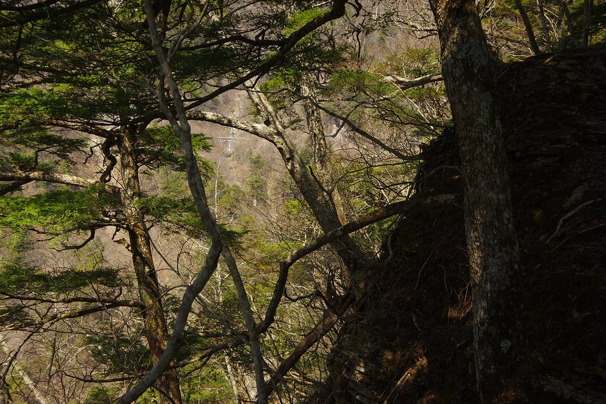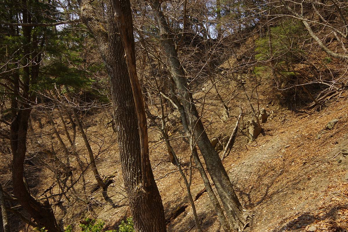 尾根の上は狭く、自由に歩き回ることは難しかったが、全く動けないわけではなく、角度を変えて何度かアザミ沢側を覗き込んでいるうちに、先ほど登った分と等しい約10mの落差の下に、確かに細々とした平場があるのが分かった。