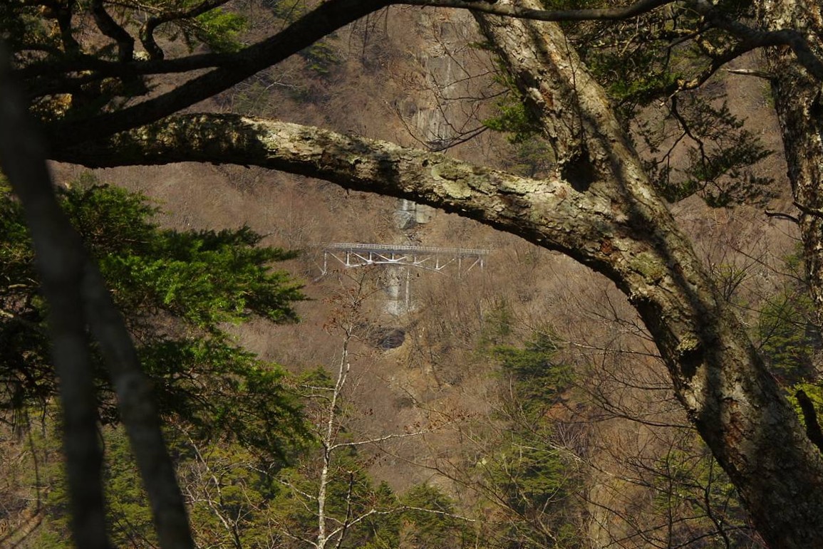 あそこに見える立派なトラス橋は、南アルプス林道に架かる大崖沢橋(おおかれさわはし)であるようだが、もとは昭和30年代に野呂川林道として整備された橋である。そしてその前後の道は、我らが早川林鉄の再利用路盤である(らしい……事前読の『トワイライトゾ〜ンマニュアル7』によれば)。