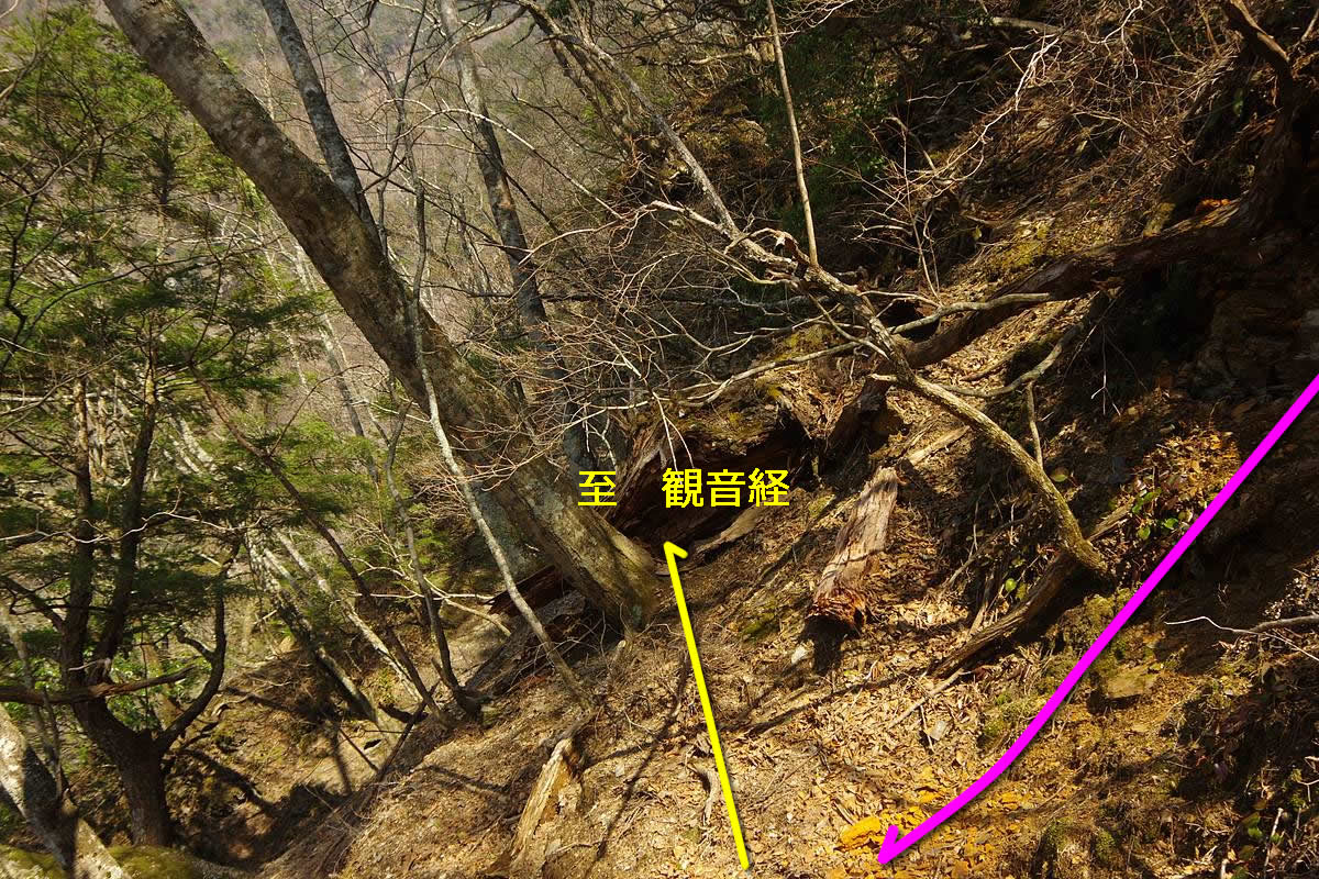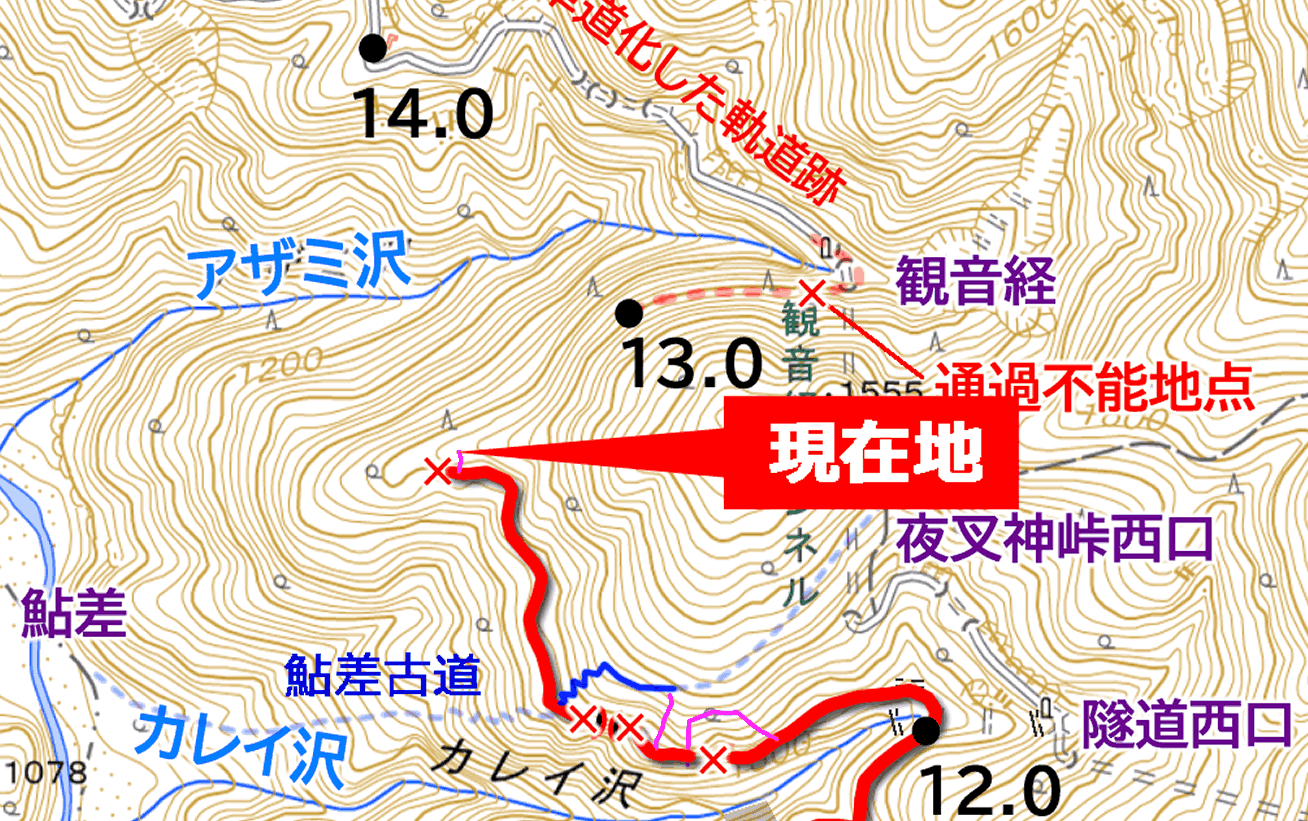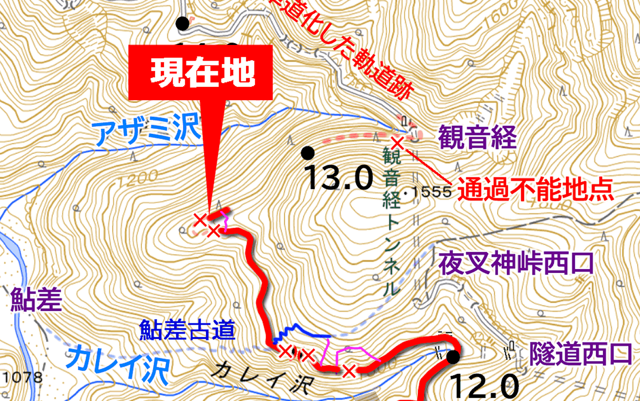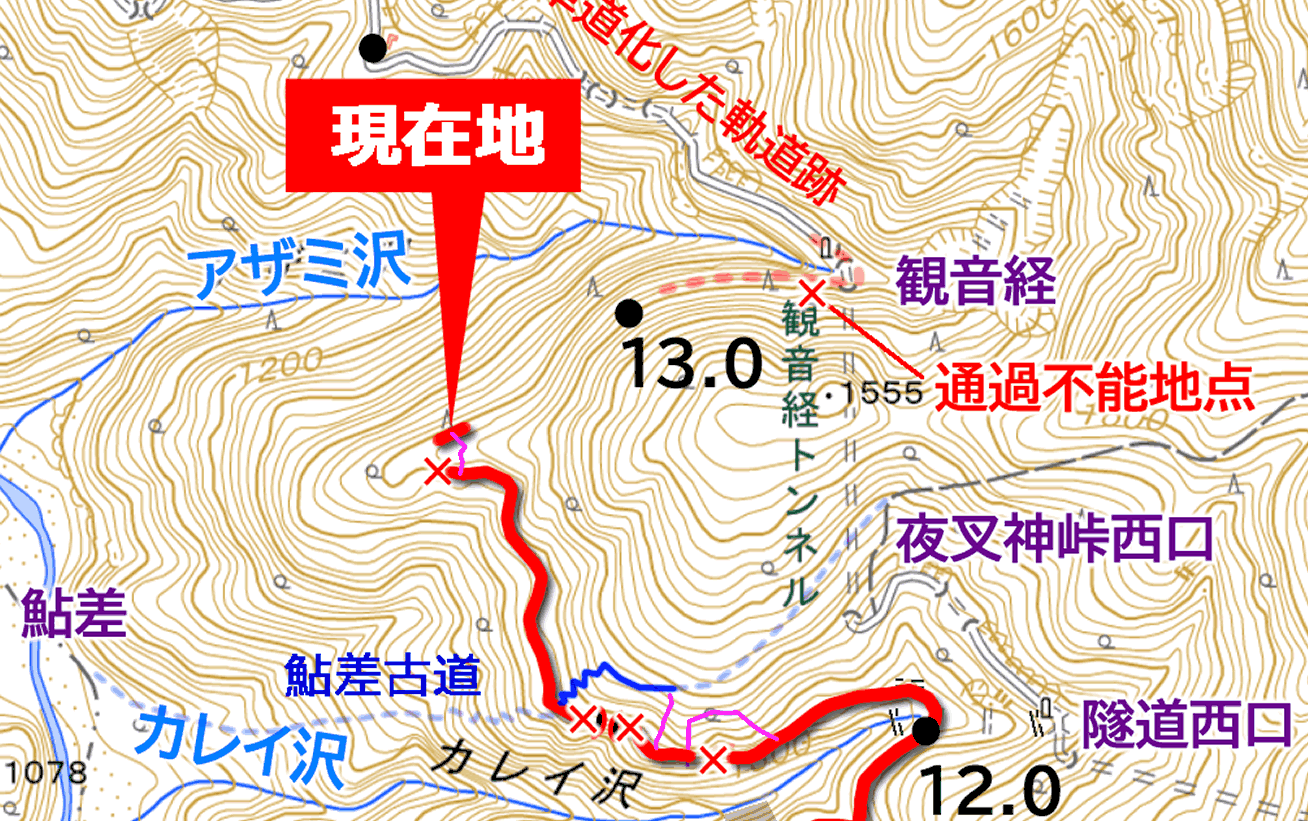 ここから観音経トンネル北口まで、かつては確実に軌道が貫通していた区間だが、等高線長ベースで480mが未踏破に終わった。