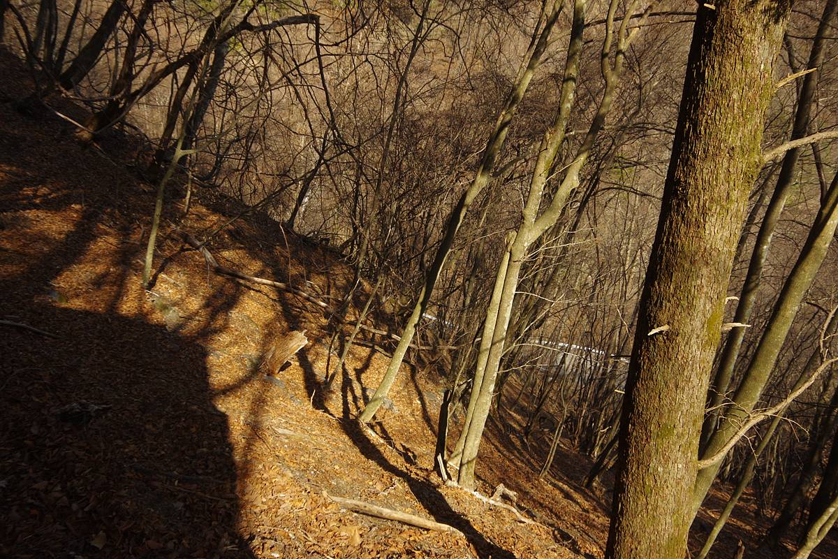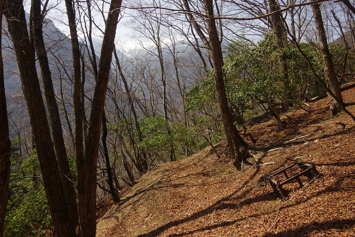 登山道としても、山仕事道としても、昭和30年代にはほぼ役目を終えて、地形図やガイドブックからも削除されてしまったこの古道だが、下草のない穏やかな疎林の道は完全に保存されており、落葉が所々厚く堆積していること以外、現役の道さながらであった。