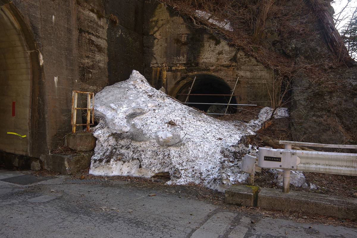 また、昨日今日を通じても初めて見る量の残雪の山が、小さな坑口を塞ぎそうになっていたが、これは高い岩壁に囲まれた日陰の谷底という立地が原因だろう。