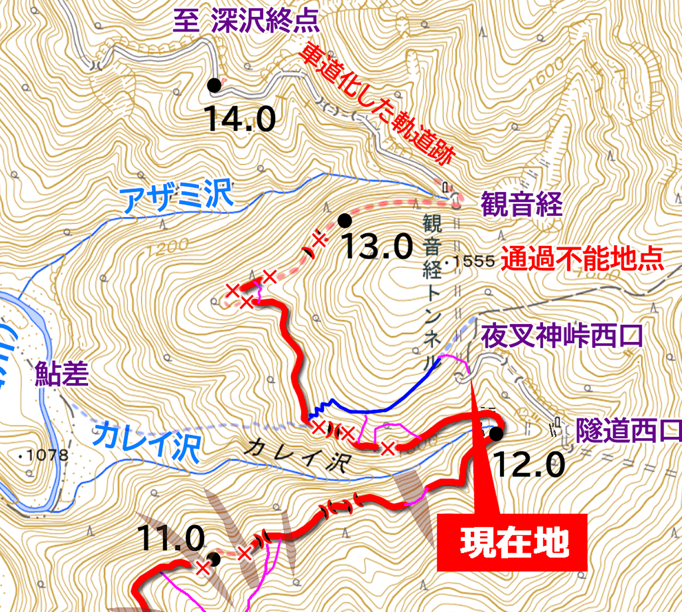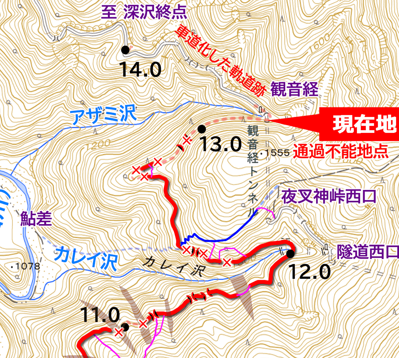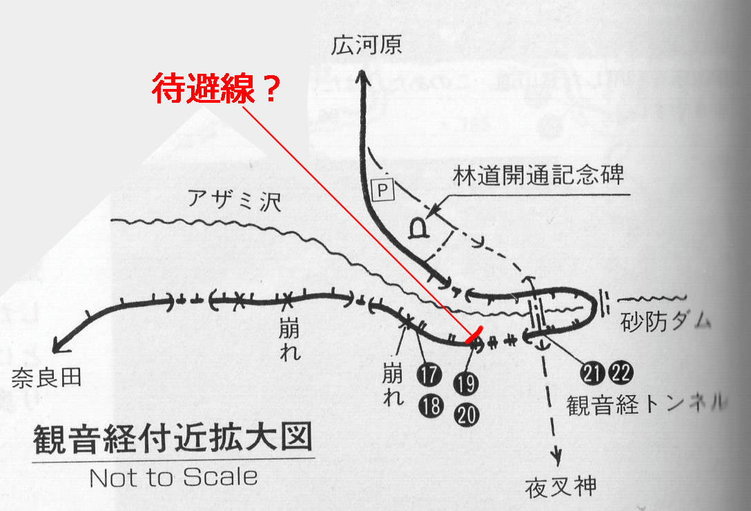 しかも枝道は極めて短く、分岐から10m足らずで、アザミ沢およびその崖壁によって進路を絶たれている。