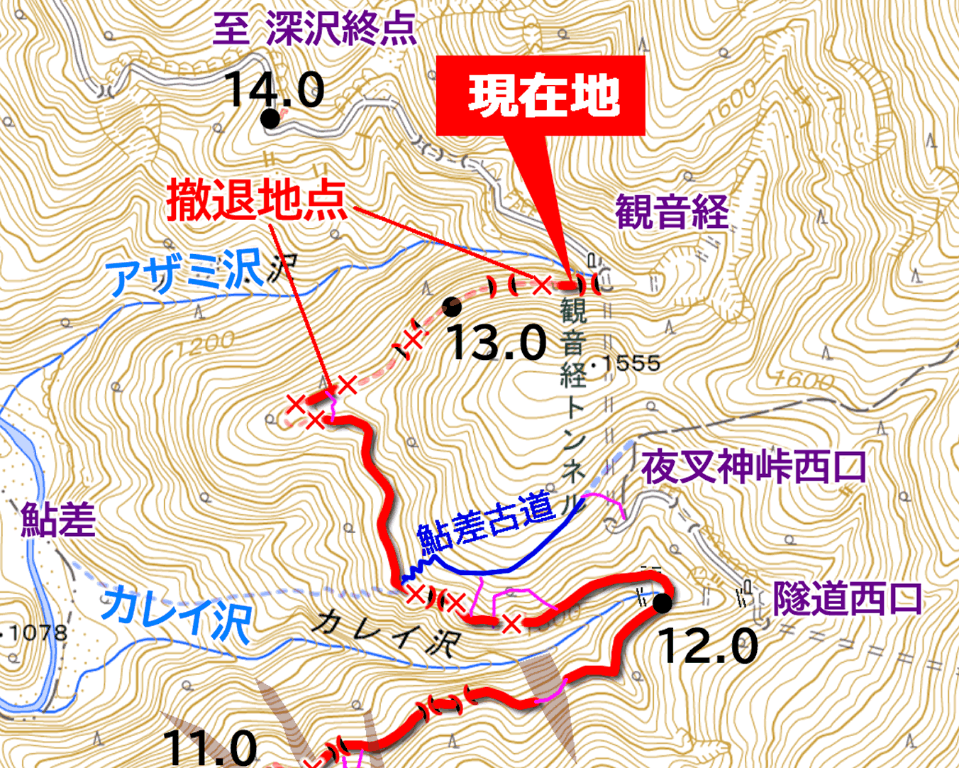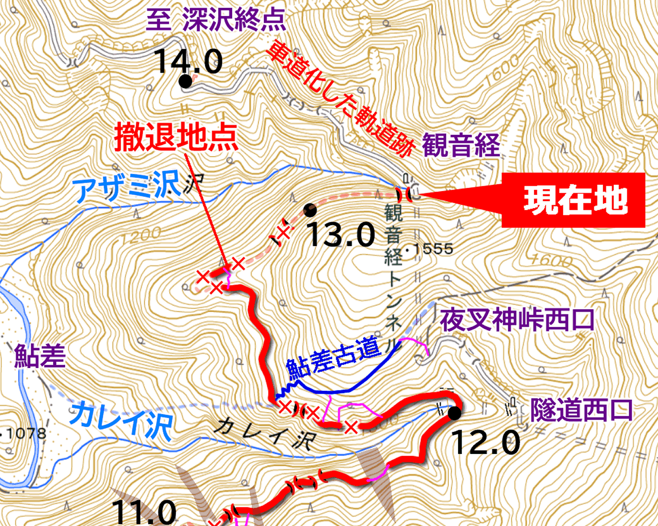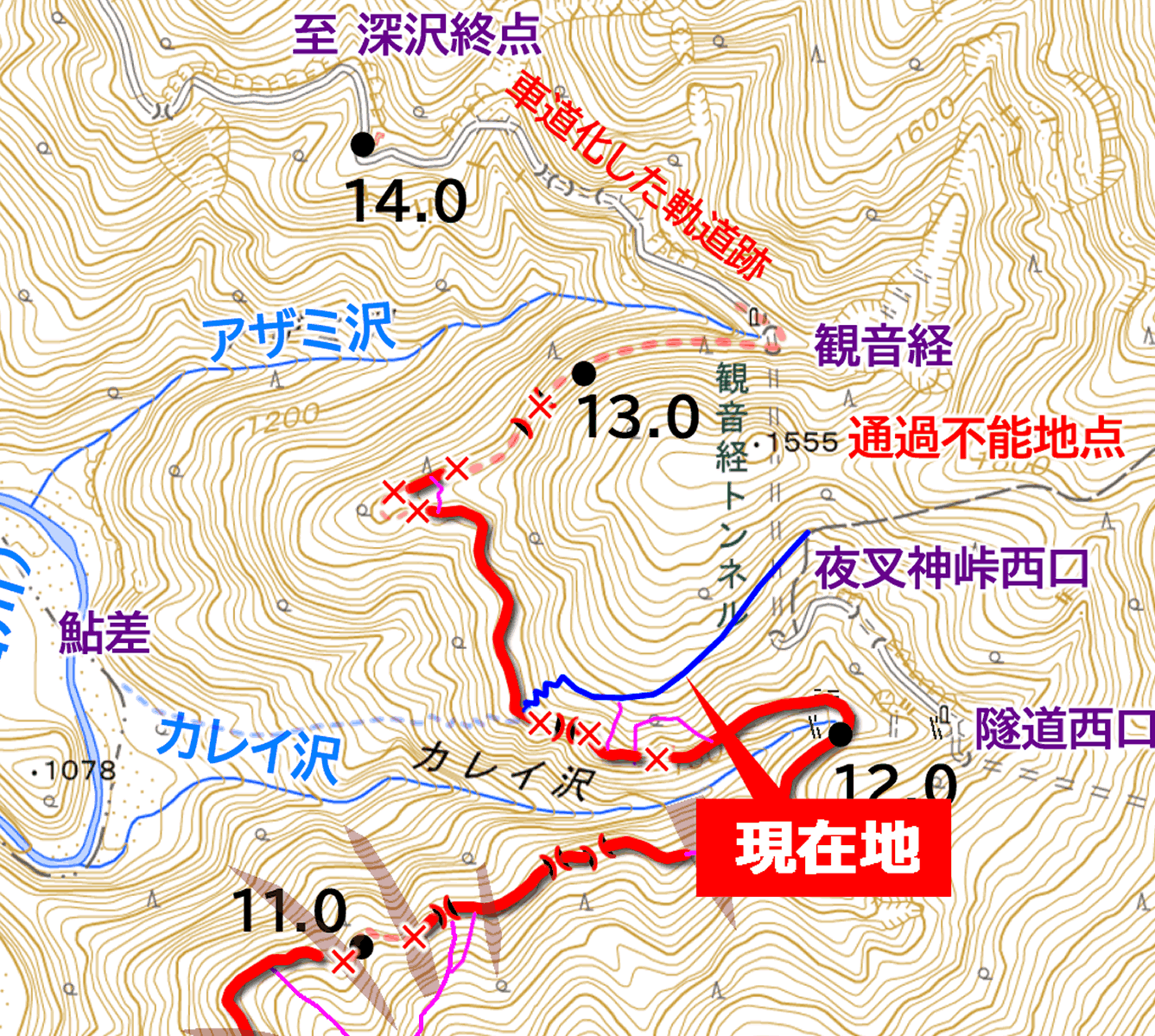 しかも枝道は極めて短く、分岐から10m足らずで、アザミ沢およびその崖壁によって進路を絶たれている。