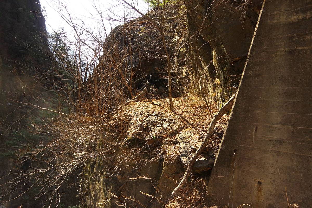 手前の低いところから奥の路盤へ登る際、狭い縁のどこかに体重を掛けねばならないのだが、いかにも脆そうであり、突然崩れたりしないかという怖さがあった。